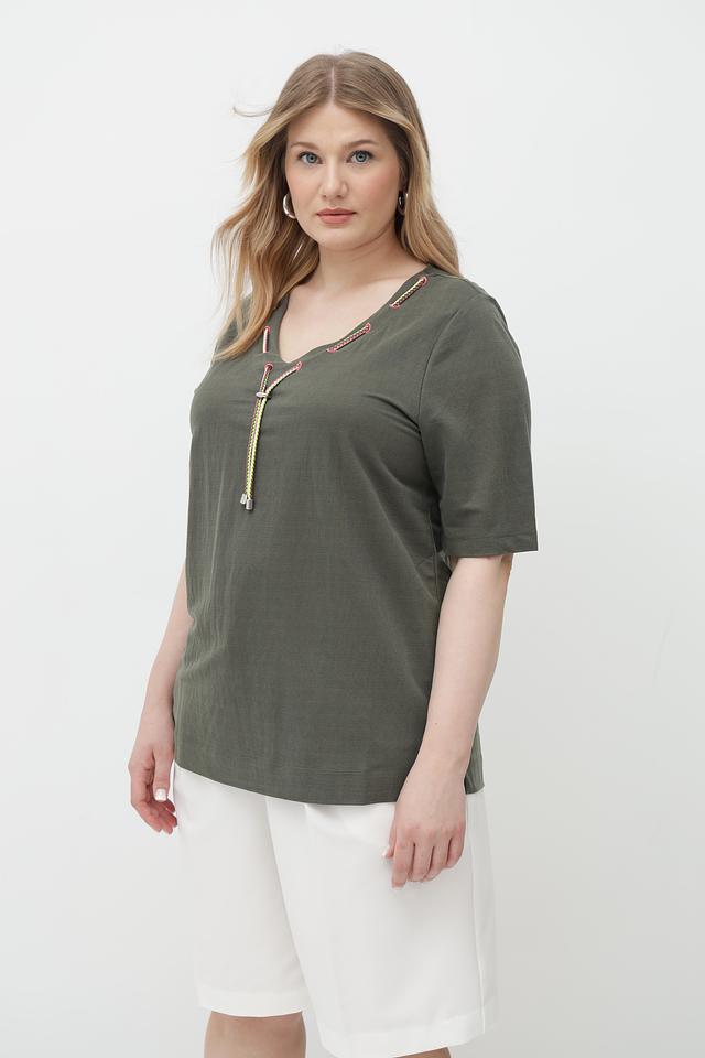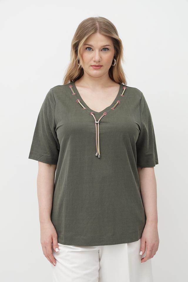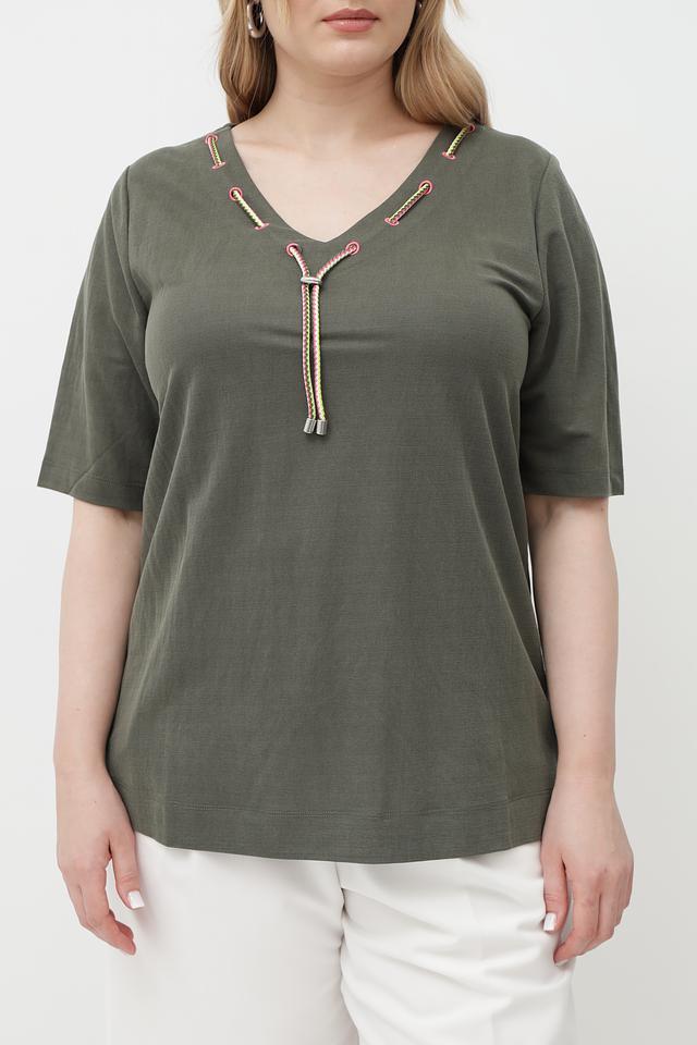 Женская футболка Via Appia оливкового цвета с оригинальной отделкой в виде завязок на V-образном вырезе. Изготовлена из мягкого и приятного к телу сочетания вискозы и полиамида. Состав: вискоза 50%, полиамид 50%