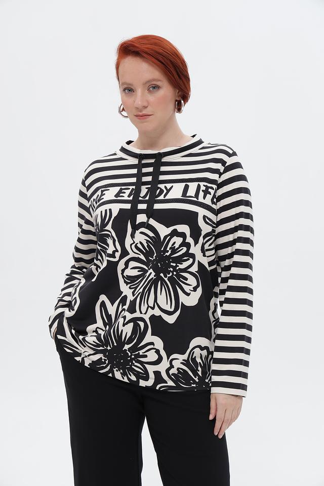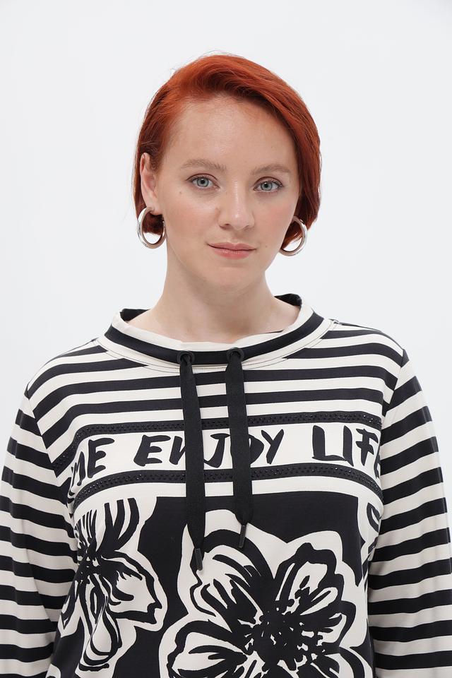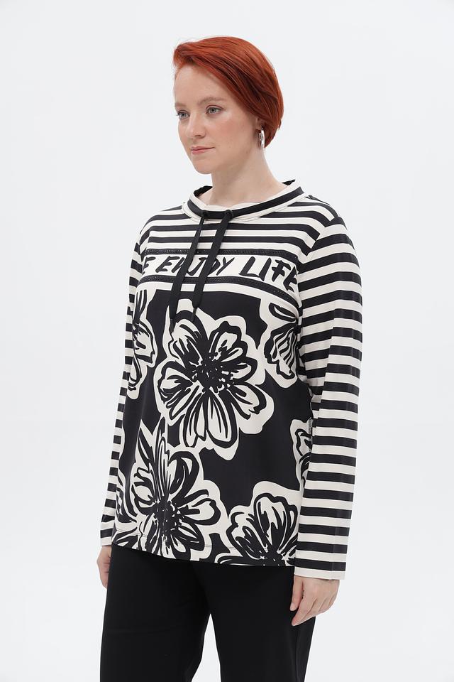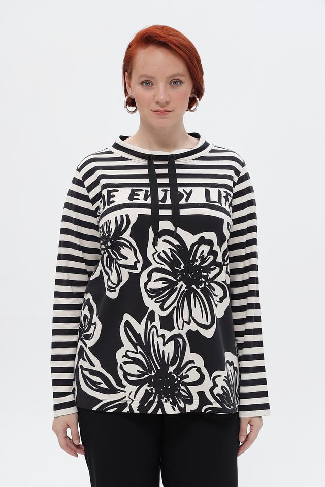 Стильный пуловер Via Appia в бело-чёрную полоску, украшенный крупным цветочным принтом и надписью. Модель с длинными рукавами и округлым вырезом горловины. Идеальный вариант для создания повседневного образа. Состав: вискоза 95%, эластан 5%