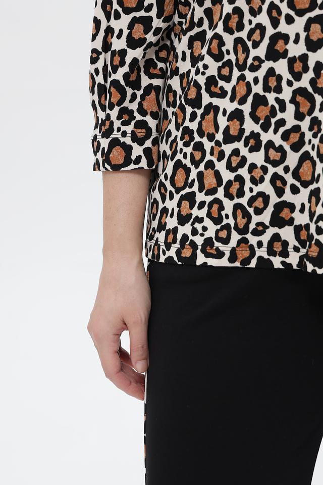 Женская футболка от бренда Via Appia выполнена в бежевом цвете и украшена выразительным леопардовым принтом.