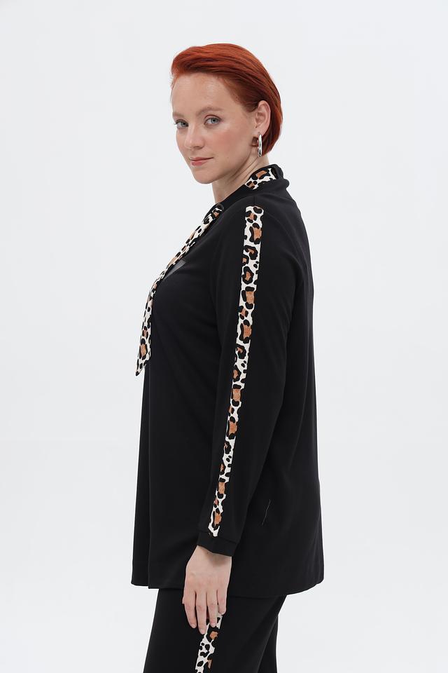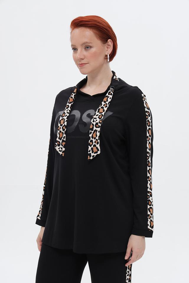 Пуловер имеет свободный крой, который не сковывает движения. Капюшон добавляет практичности, а контрастные леопардовые полосы на рукавах придают изделию оригинальность и динамичность.