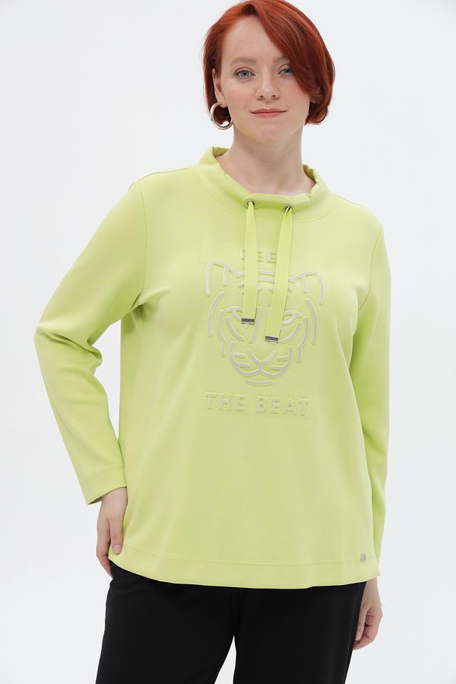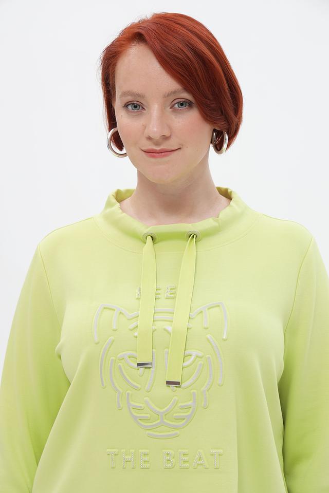 Особенность дизайна – эффектный принт с изображением тигра, выполненный в тон изделия. Пуловер имеет вырез-стойку с небольшим шнурком, который можно завязать по-разному, создавая различные образы.