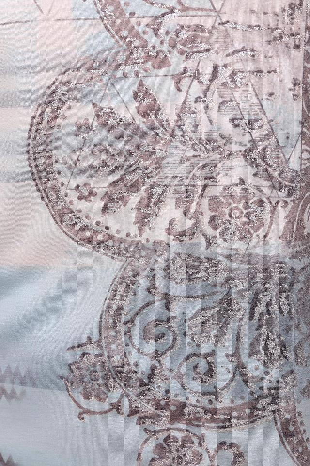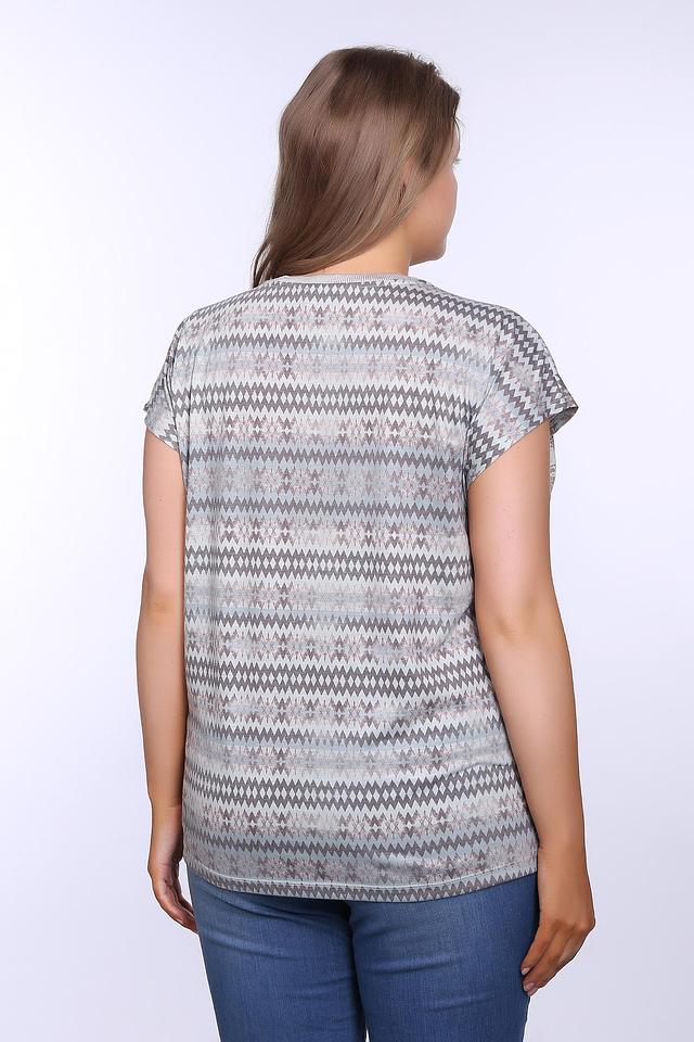 Модель выполнена в приятной цветовой гамме и украшена оригинальным принтом, который придает образу женственности и шарма. V-образный вырез горловины деликатно подчеркивает зону декольте, а короткие рукава обеспечивают комфорт в течение всего дня.