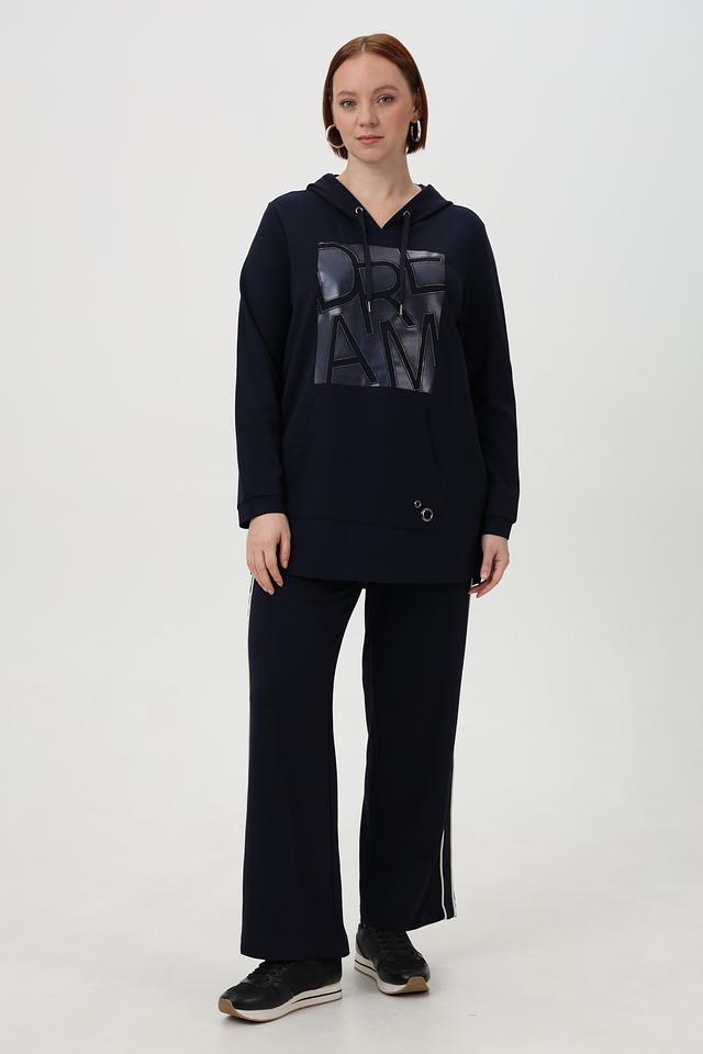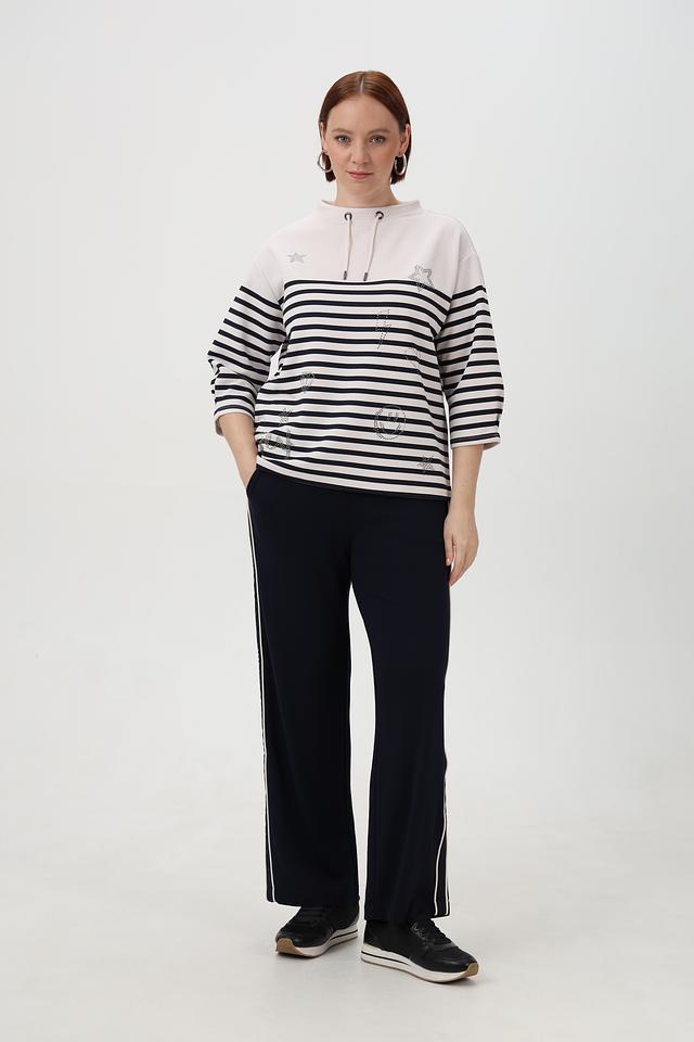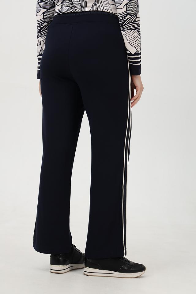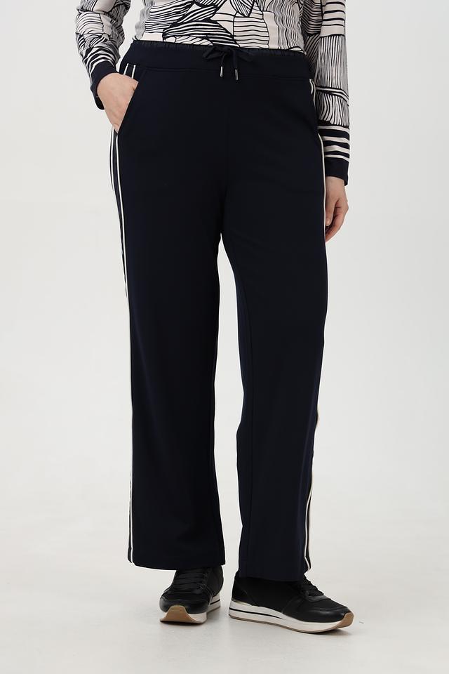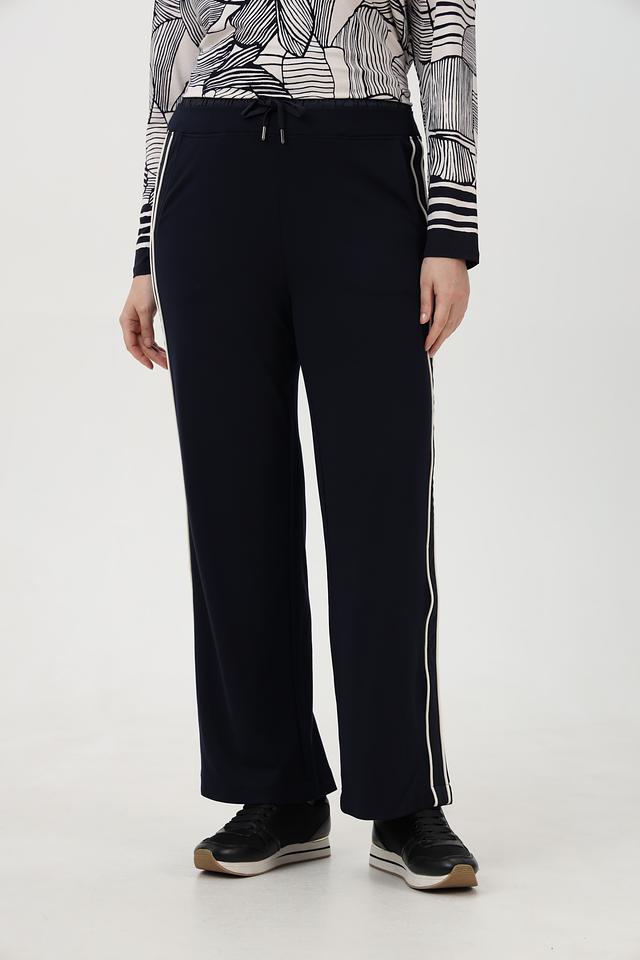 Брюки имеют прямой крой и зауженный книзу силуэт, что делает их универсальными для разных типов фигур. Эластичный пояс с кулиской обеспечивает комфортную посадку и свободу движений. По бокам брюк расположены декоративные белые полосы, которые придают им спортивный и современный вид.