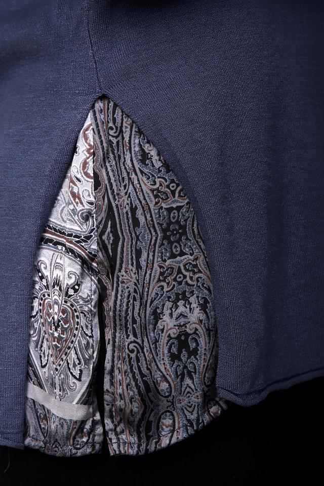 Принт на боковой части пуловера выполнен в восточном стиле, сочетая в себе различные оттенки серого, коричневого и бежевого цветов. Он добавляет образу оригинальности и изысканности. Этот пуловер станет отличным выбором для создания повседневных и вечерних образов.