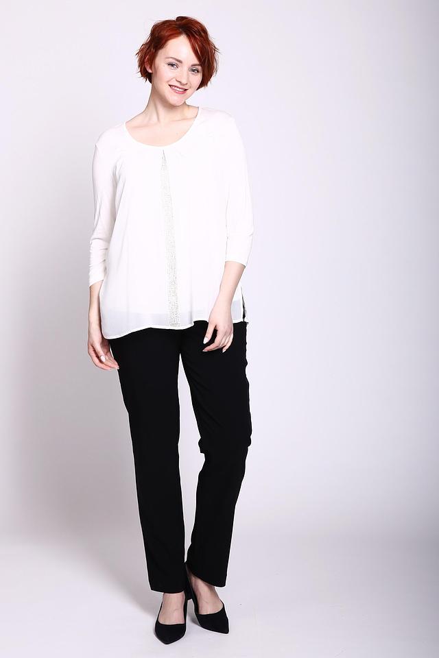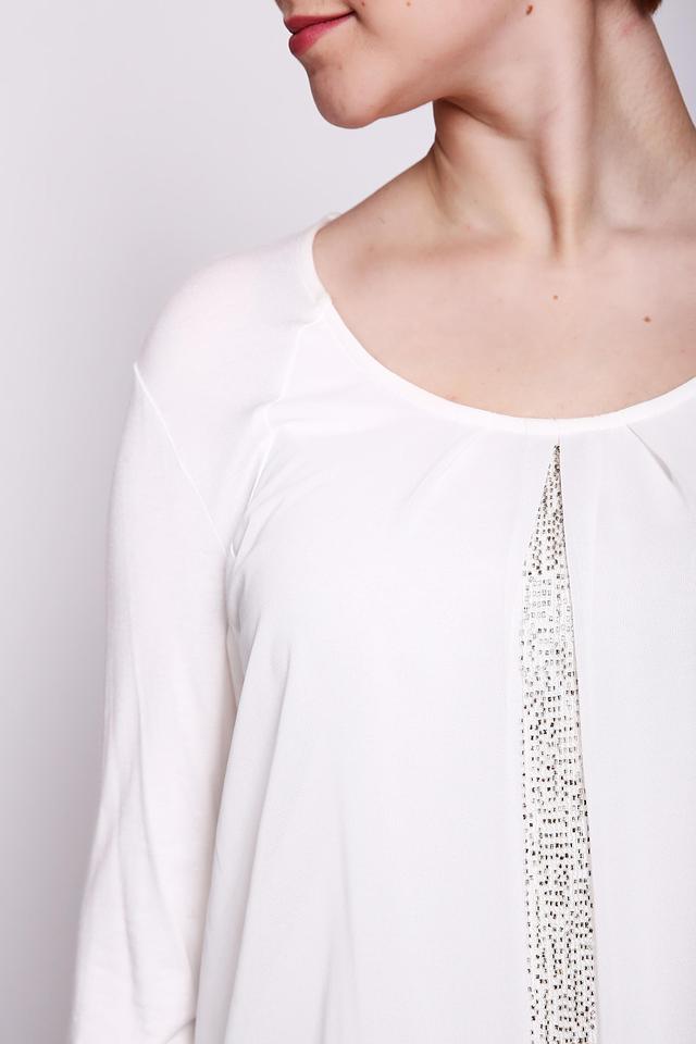 Блуза имеет V-образный вырез горловины, который украшен деликатной кружевной вставкой. Рукава длиной три четверти делают ее подходящей для любого времени года. Свободный крой обеспечивает комфорт и свободу движений.