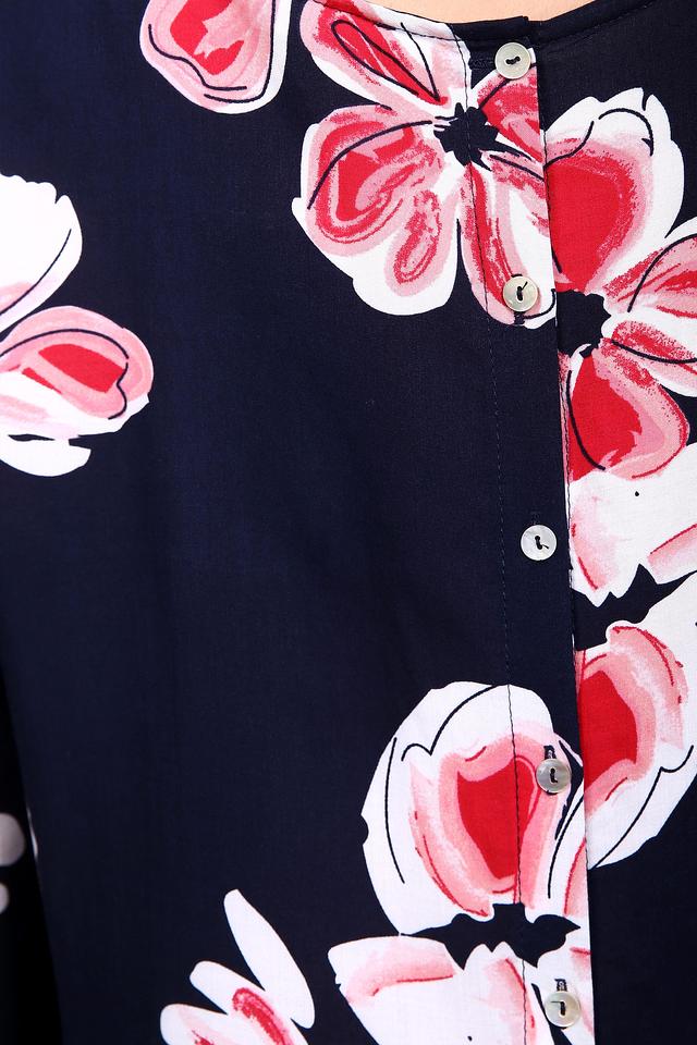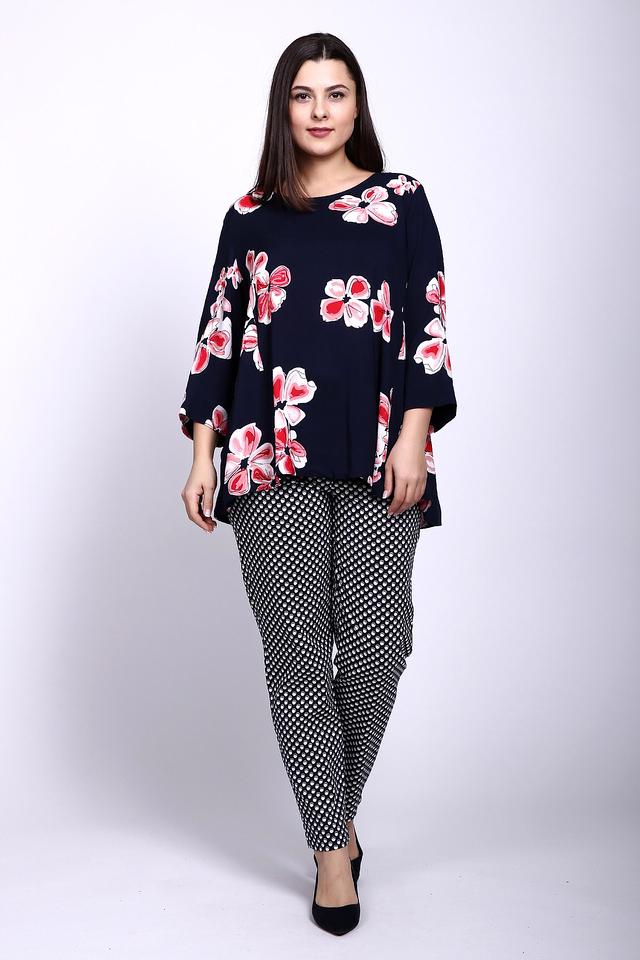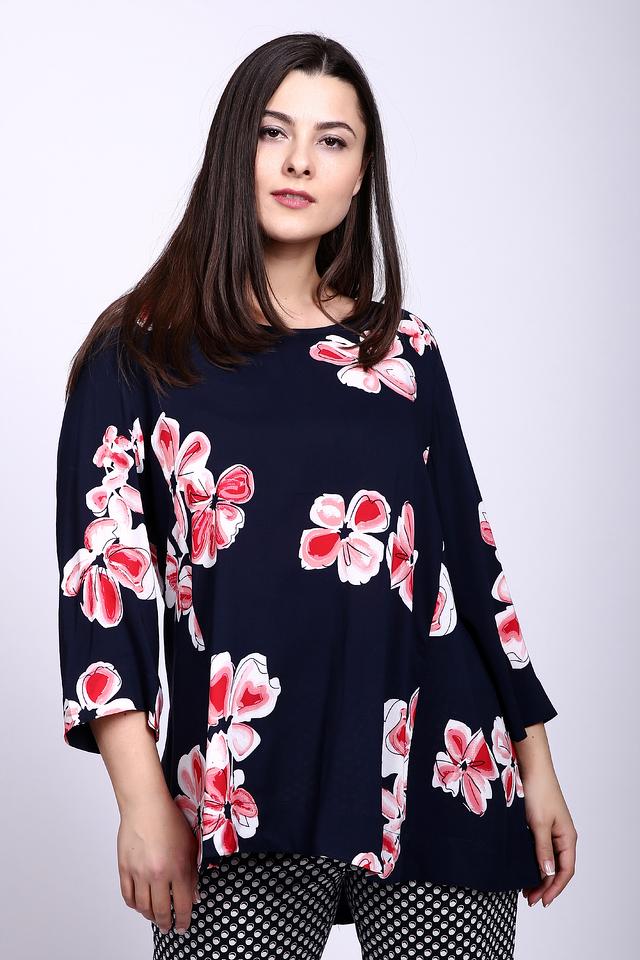 - Дизайн: Темно-синяя основа с ярким цветочным принтом. Контрастное сочетание цветов и крупный рисунок делают блузу выразительной и модной.