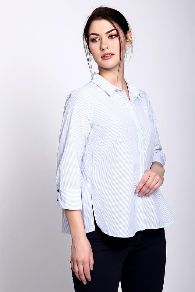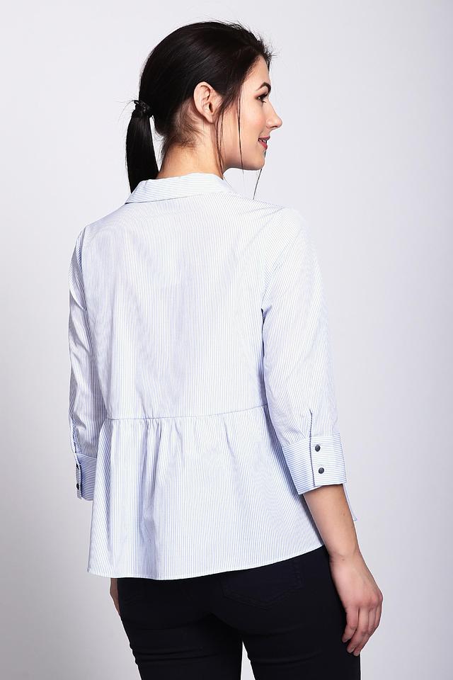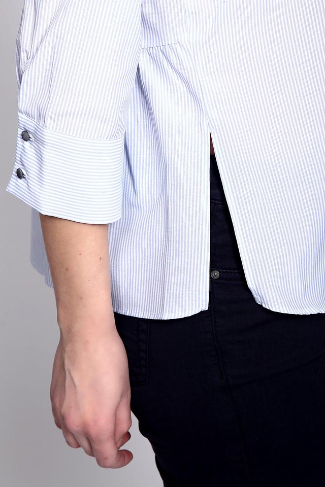 Особенностью данной блузы является её полосатый рисунок в голубых тонах. Свободный силуэт и небольшой сбор по низу создают легкий и женственный образ. Эта блуза идеально подойдет для работы, учебы или повседневной носки.
