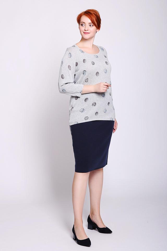 Этот стильный пуловер от Via Appia выполнен в светло-сером цвете и украшен узором из серебристых горошин. Модель имеет округлый вырез горловины и рукава три четверти, что делает его универсальным для различных образов.