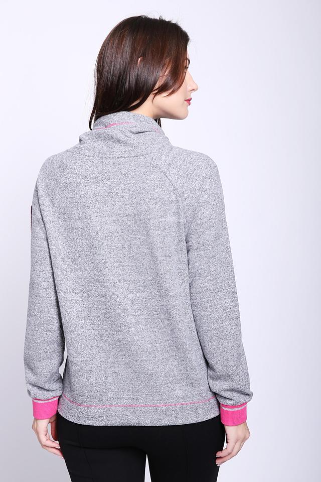 Пуловер имеет воротник-стойку с завязками-шнурками, а манжеты и нижняя кромка отделаны яркой розовой полосой, что добавляет образу контрастности и динамики. Изготовлен из мягкой и приятной к телу ткани, состоящей из 80% вискозы, 15% полиэстера и 5% эластана.