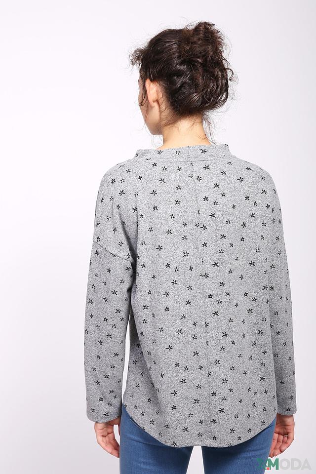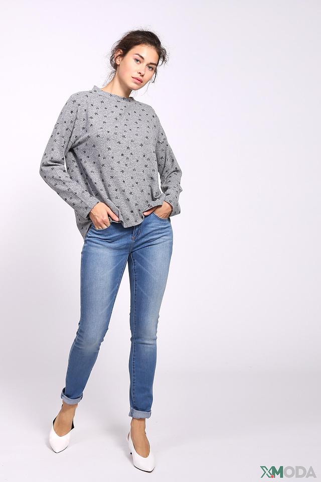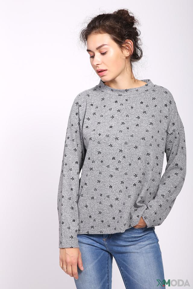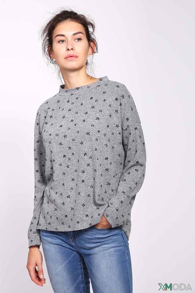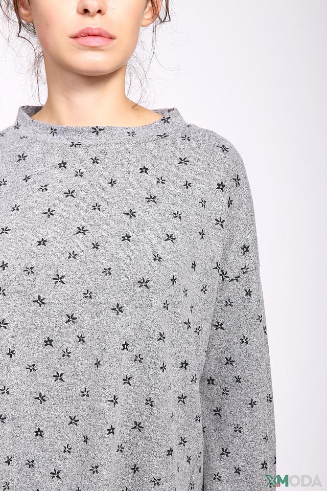 Пуловер имеет свободный крой и круглый вырез горловины. Его украшает мелкий цветочный принт, который придает ему женственность и легкость. Длинные рукава слегка спущены, что добавляет образу непринужденности.