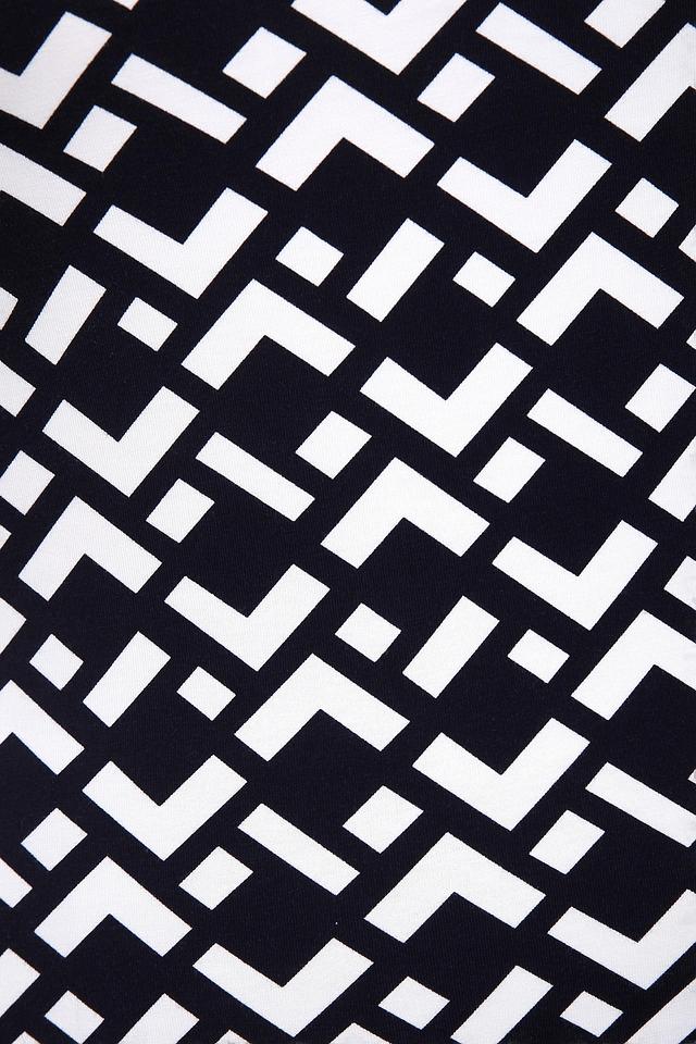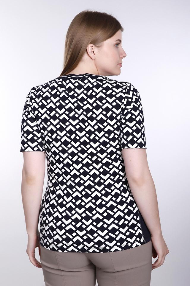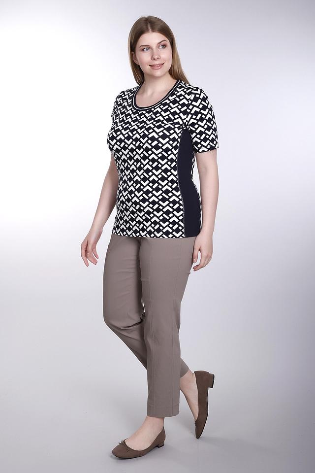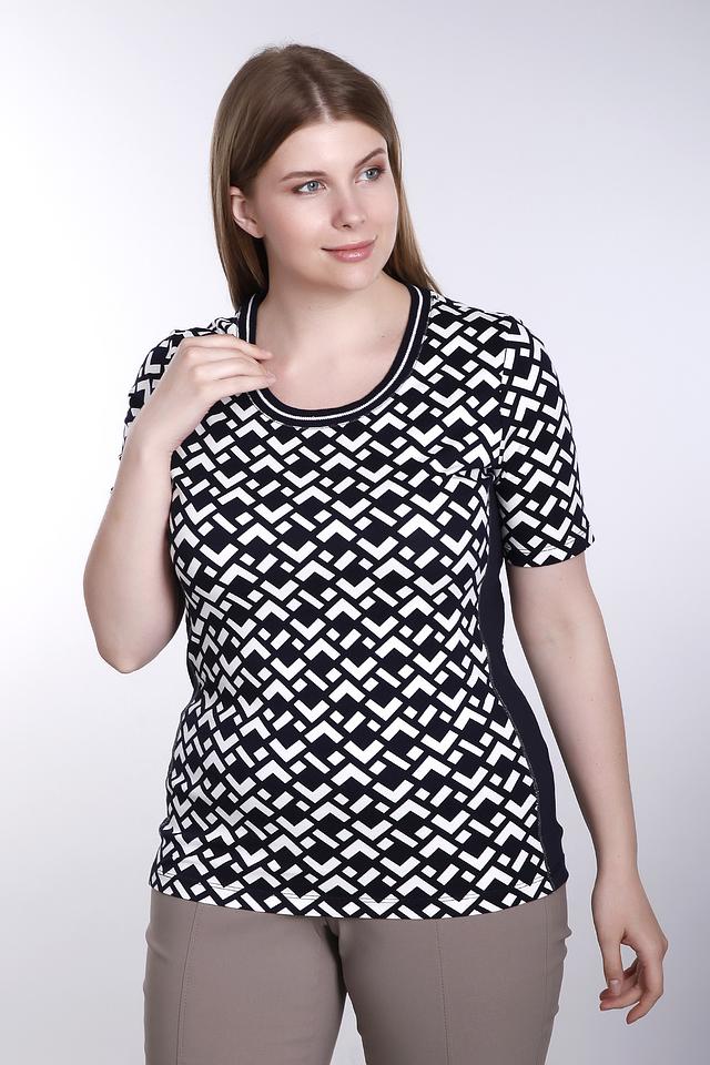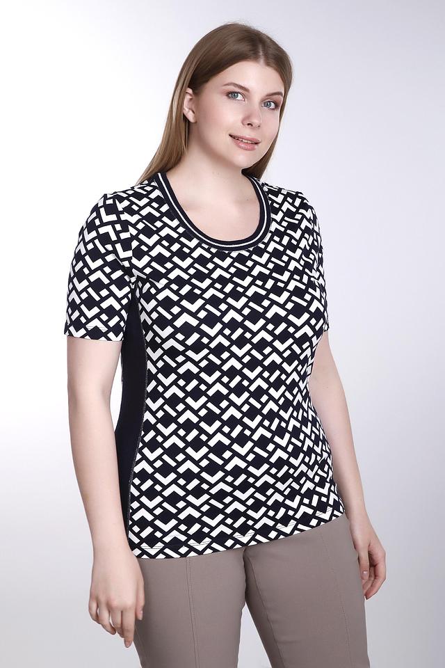 Футболка имеет прямой крой и короткий рукав. Главная особенность модели – эффектный геометрический принт в чёрно-белой гамме, который придаёт ей современный и динамичный вид. Вставки из однотонной ткани по бокам визуально стройнят фигуру.