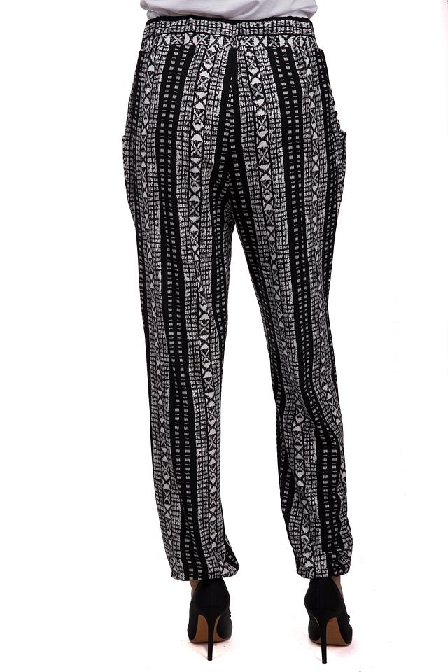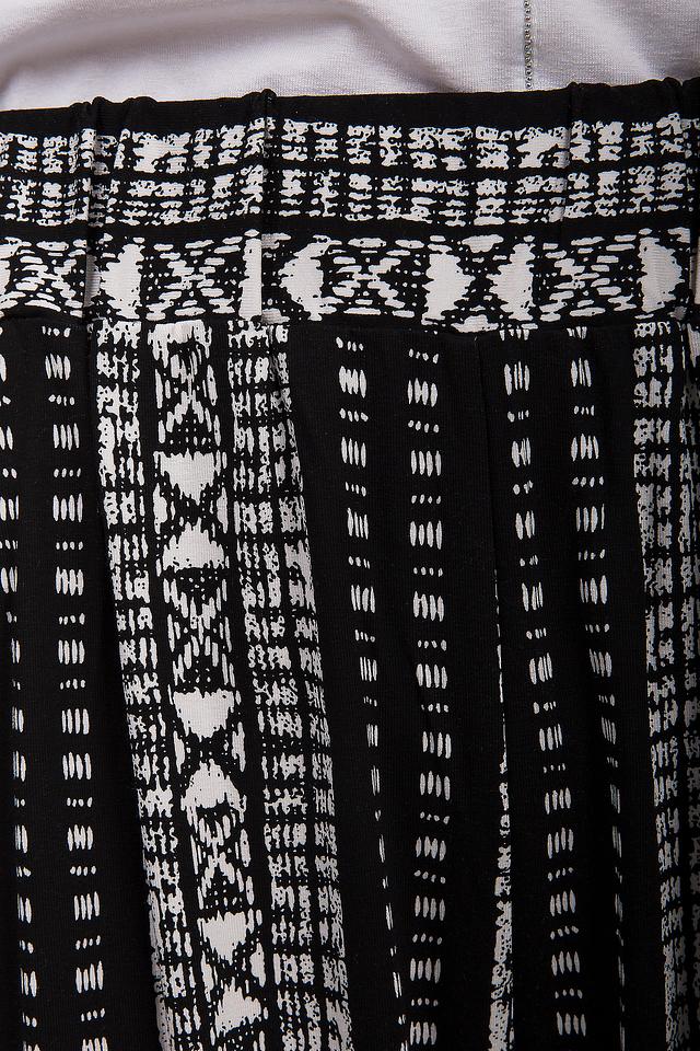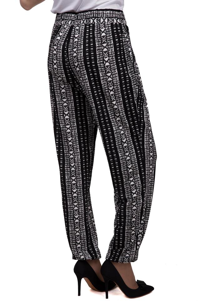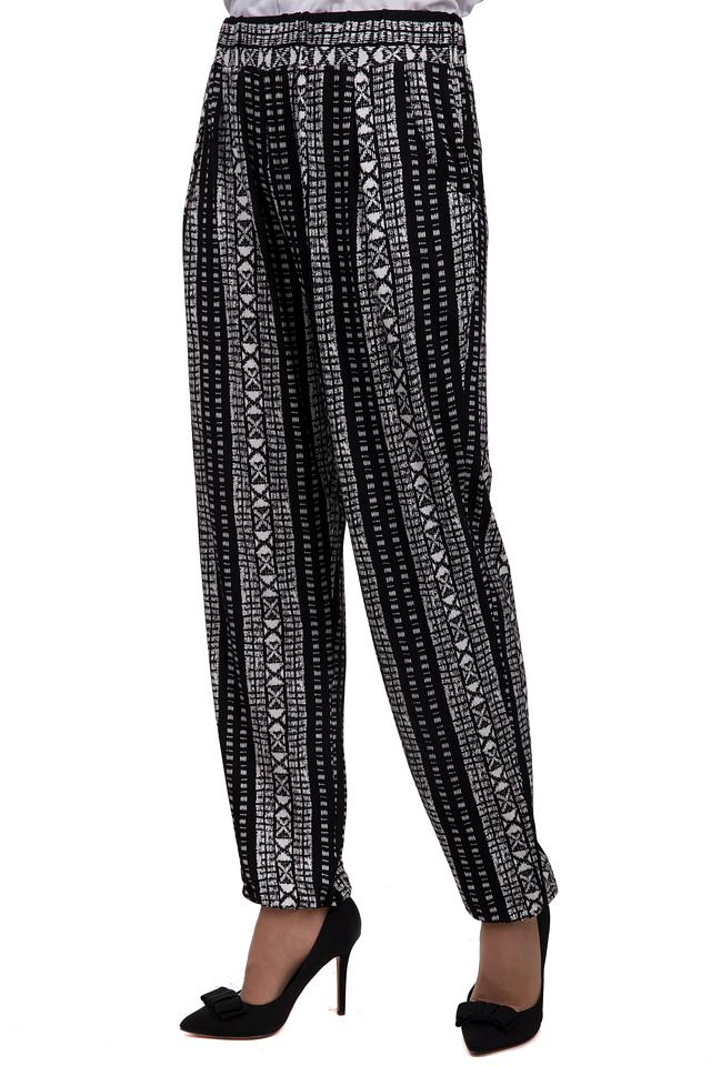 Женские брюки Via Appia чёрного цвета с оригинальным геометрическим принтом. Модель выполнена из мягкой вискозы с добавлением эластана, обеспечивающего комфортную посадку и свободу движений. Состав: вискоза 95%, эластан 5%