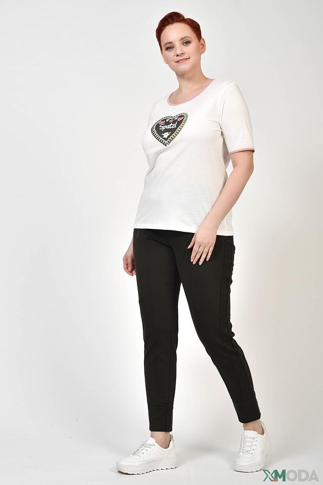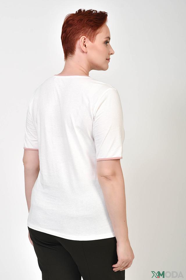 Футболка имеет прямой крой, короткие рукава и круглый вырез горловины, отделанный тонкой полоской в розовый цвет. Такой дизайн подчеркивает женственность и аккуратность силуэта. Эта футболка идеально подойдет для создания повседневных образов, сочетаясь с джинсами, шортами или юбками.