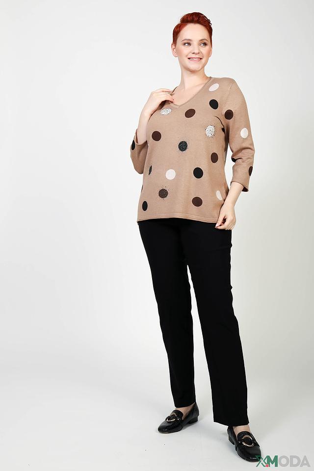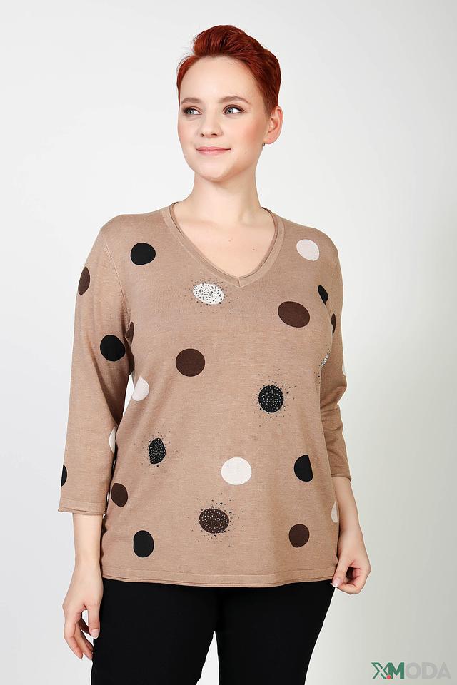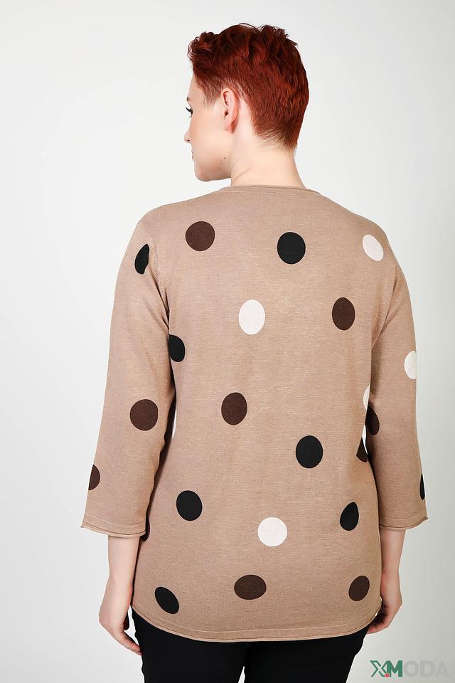 Пуловер имеет V-образный вырез и рукава длиной 3/4, что делает его универсальным для различных образов. Привлекательный принт в горошек – сочетание коричневых и белых кругов – добавляет игривости и оригинальности.