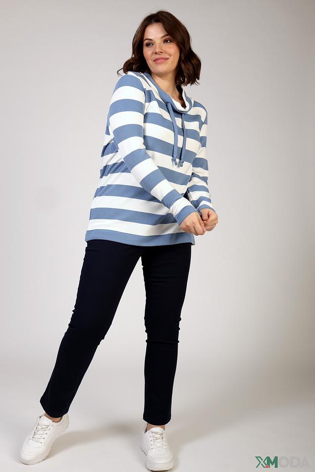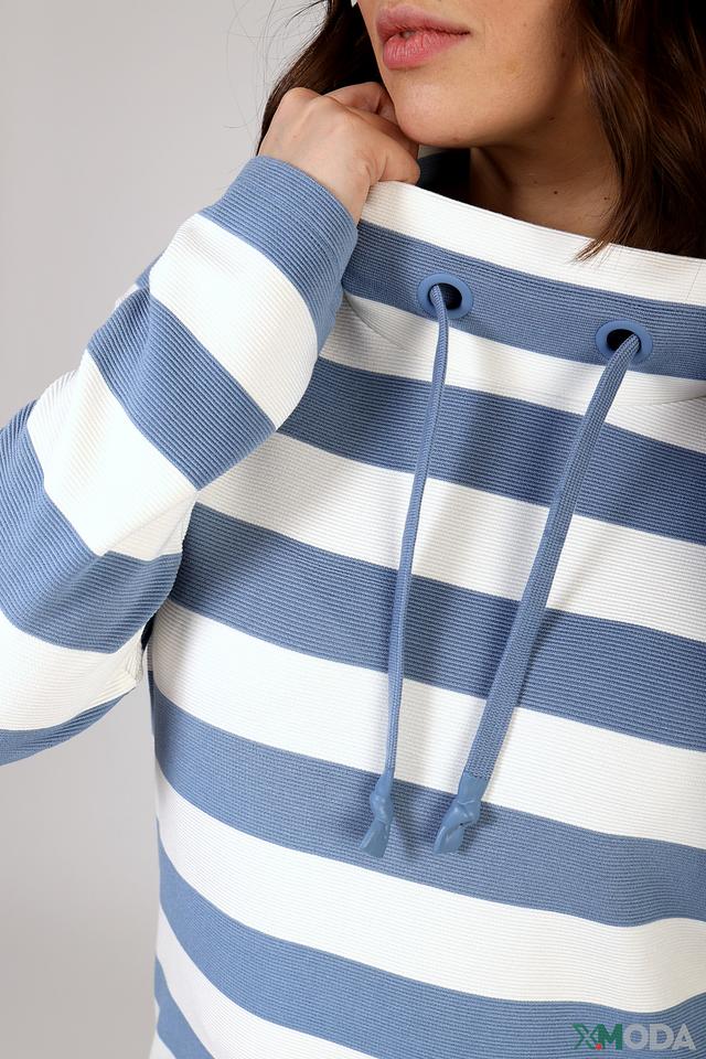 Женский пуловер Via Appia голубого цвета в полоску с удобным капюшоном и завязками. Модель выполнена из мягкой вискозы с добавлением полиэстера и эластана, обеспечивающих комфорт и хорошую посадку. Состав: вискоза 88%, полиэстер 10%, эластан 2%