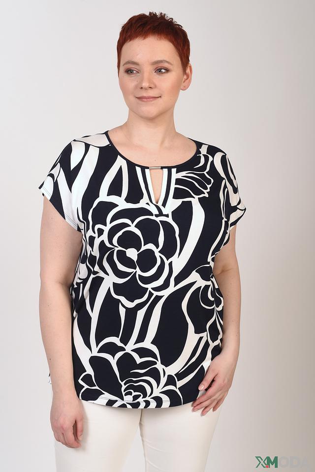 Основной цвет блузы – черный, а главным акцентом является крупный цветочный принт в белых тонах. Такой рисунок придает образу свежесть и оригинальность.
