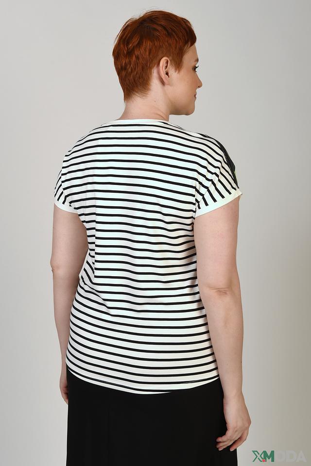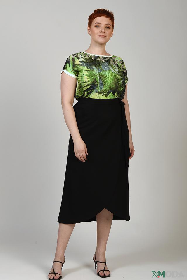 Основной цвет футболки – зеленый, с эффектным тропическим принтом, изображающим пальмовые листья. Вокруг горловины и на плечах расположена декоративная отделка из страз, придающая изделию изысканность и блеск.