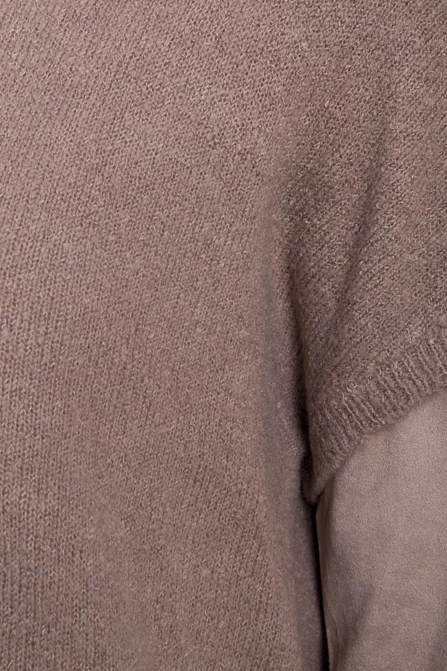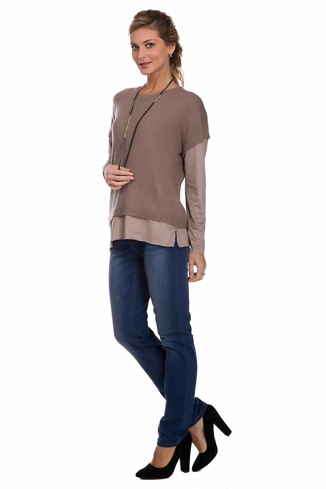 Верхний слой выполнен из мягкого трикотажа, а нижний – из более плотной ткани, создавая интересный контраст. Пуловер имеет круглый вырез горловины и длинные рукава. Состав изделия включает полиакрил, полиамид, шерсть и эластан, что обеспечивает комфорт и практичность в носке.