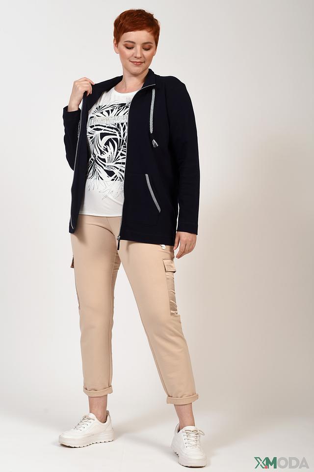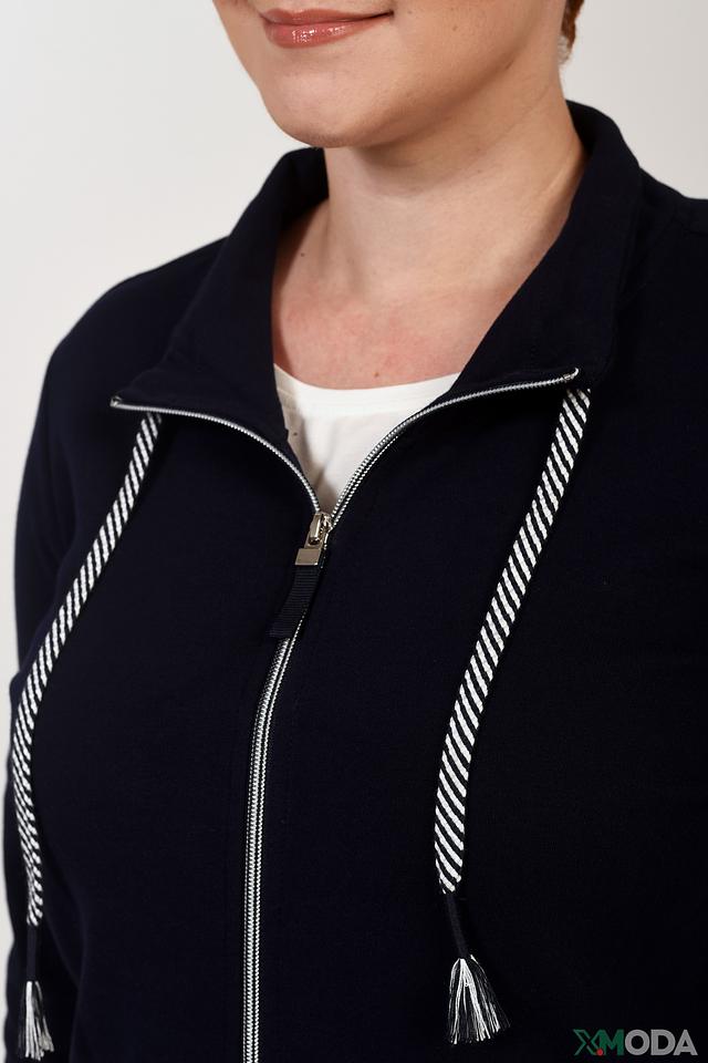 Жакет имеет удобную застёжку на молнию, украшенную декоративной полоской в белый и серый цвет, а также кисточками. Модель дополнена двумя функциональными карманами. Крой жакета обеспечивает свободу движений и комфортную посадку по фигуре.