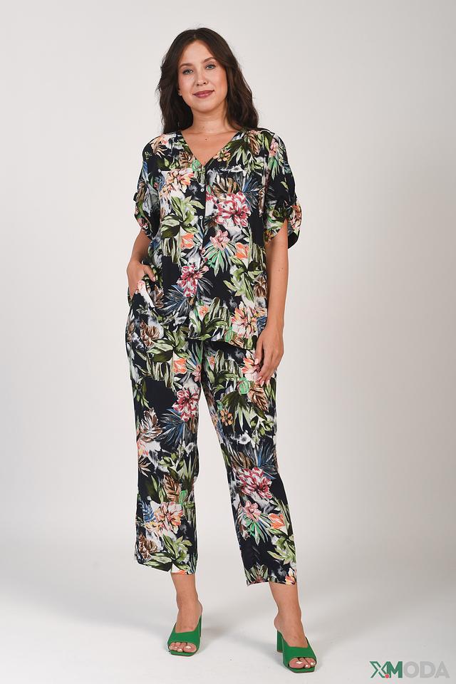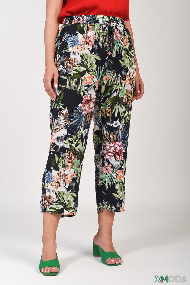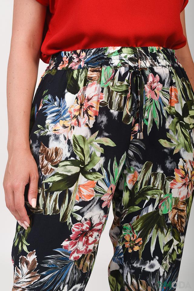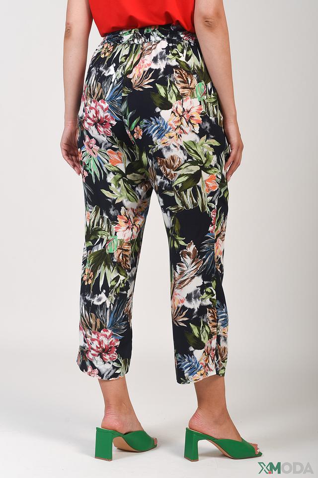 Брюки имеют прямой крой и укороченную длину, что делает их актуальными и стильными. Эластичный пояс обеспечивает удобную посадку по фигуре. Главная особенность брюк – эффектный цветочный принт, который добавляет образу женственности и легкости.