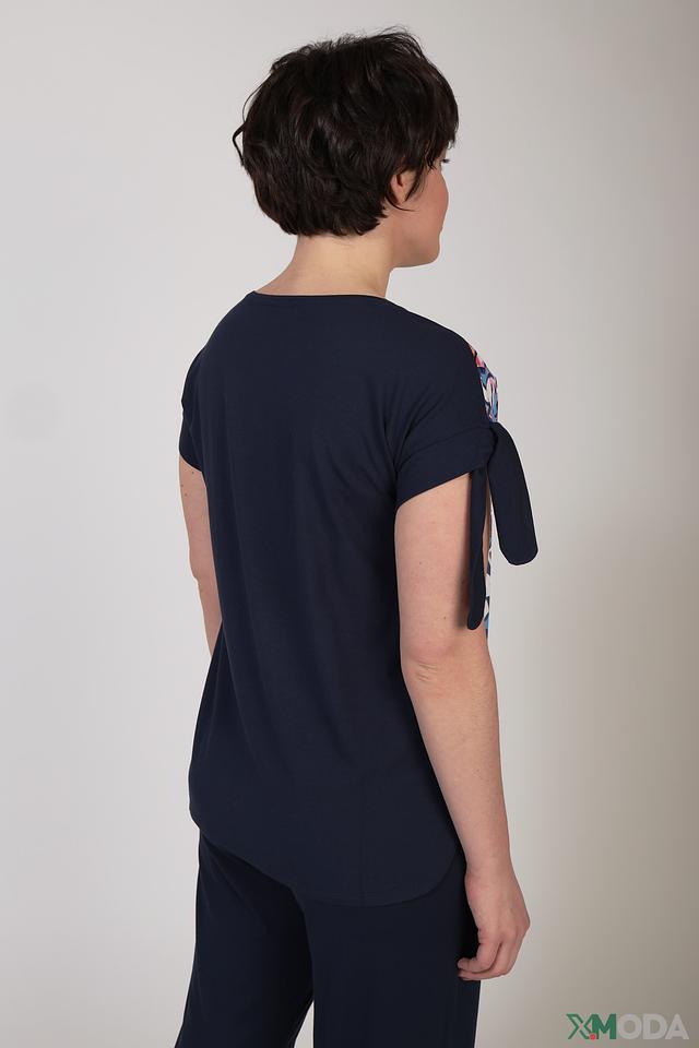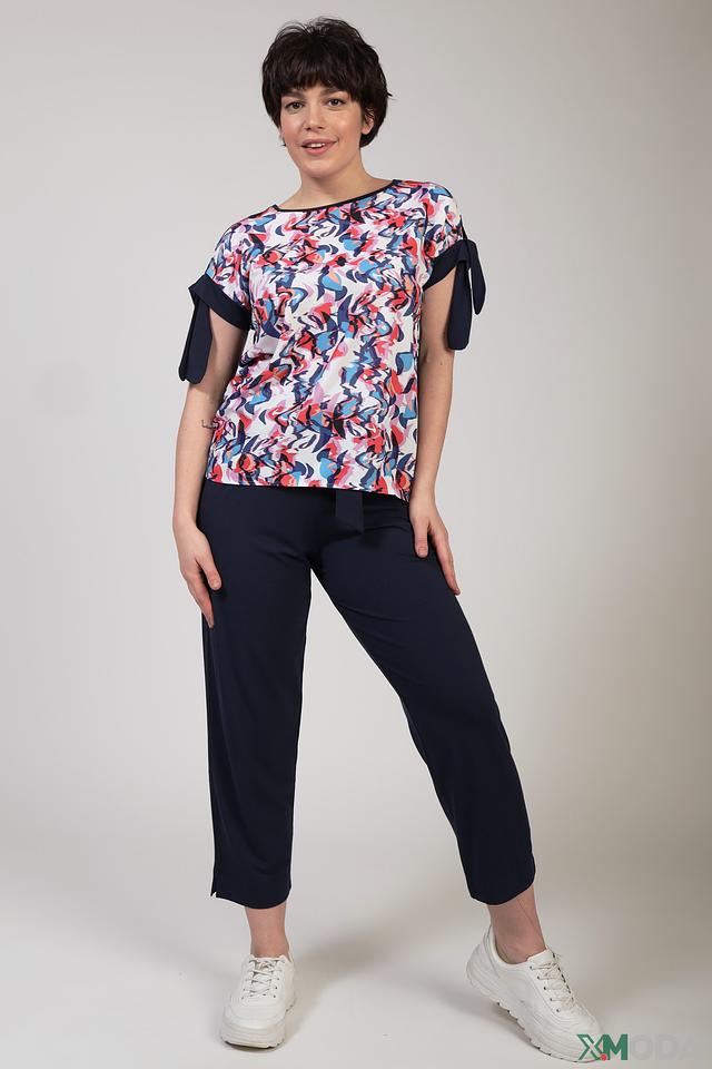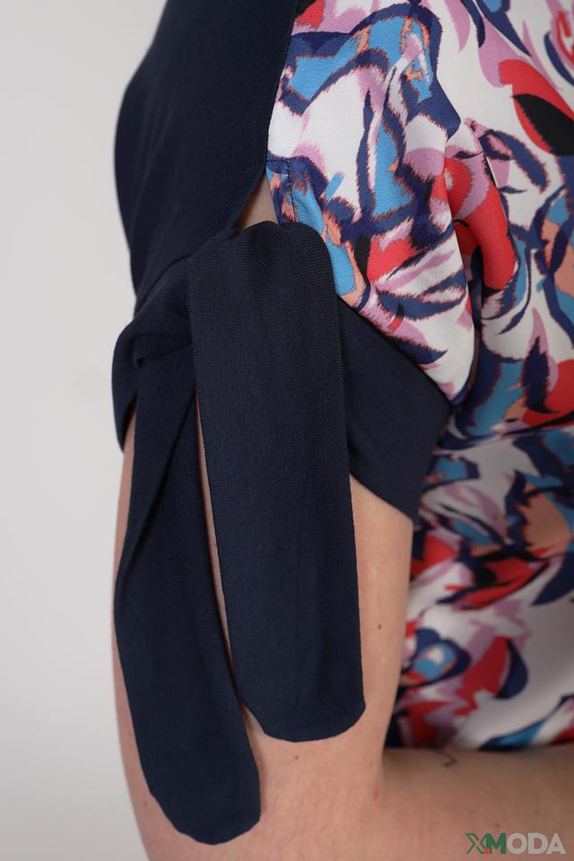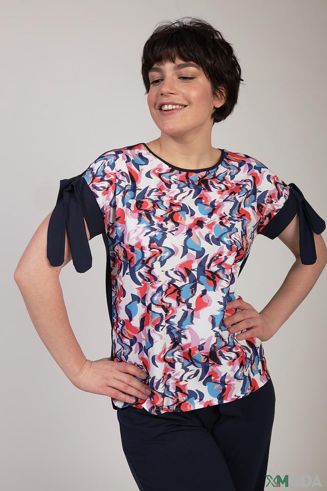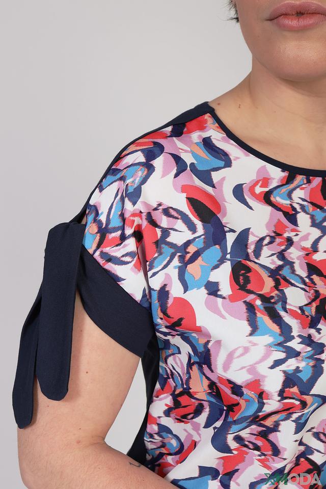 Блуза имеет короткие рукава, украшенные оригинальными завязками в виде бантов. Принт с абстрактными цветочными мотивами в ярких оттенках делает эту модель особенно привлекательной и стильной.