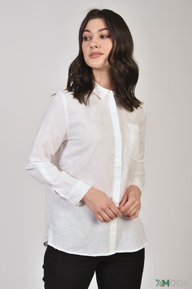 Блуза имеет классический рубашечный крой с длинными рукавами и отложным воротником. Застежка на пуговицах по всей длине позволяет регулировать степень открытости. На груди расположен накладной карман, добавляющий блузе функциональности и непринужденности.