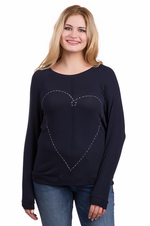 Особенностью данного пуловера является декоративное оформление в виде сердца, выполненного из мерцающих страз. Этот элемент придает изделию изысканность и оригинальность.