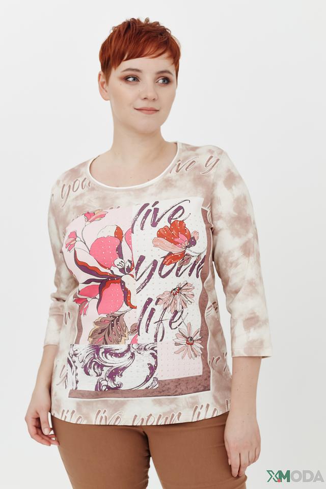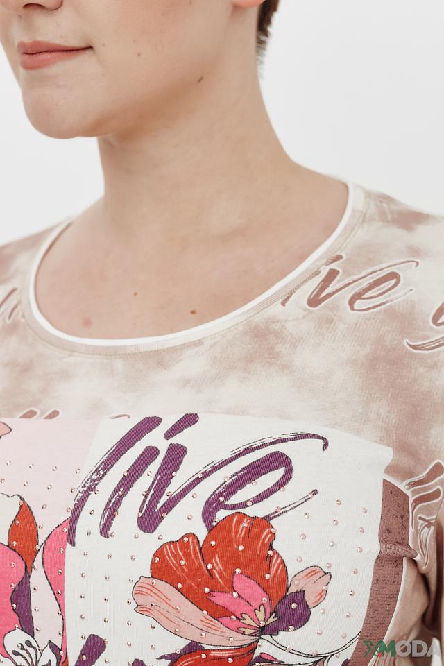 Дизайн блузы включает в себя яркие изображения цветов, выполненные в розовых, красных и зеленых оттенках. Принт дополнен надписями, что придает блузе оригинальность и индивидуальность.
