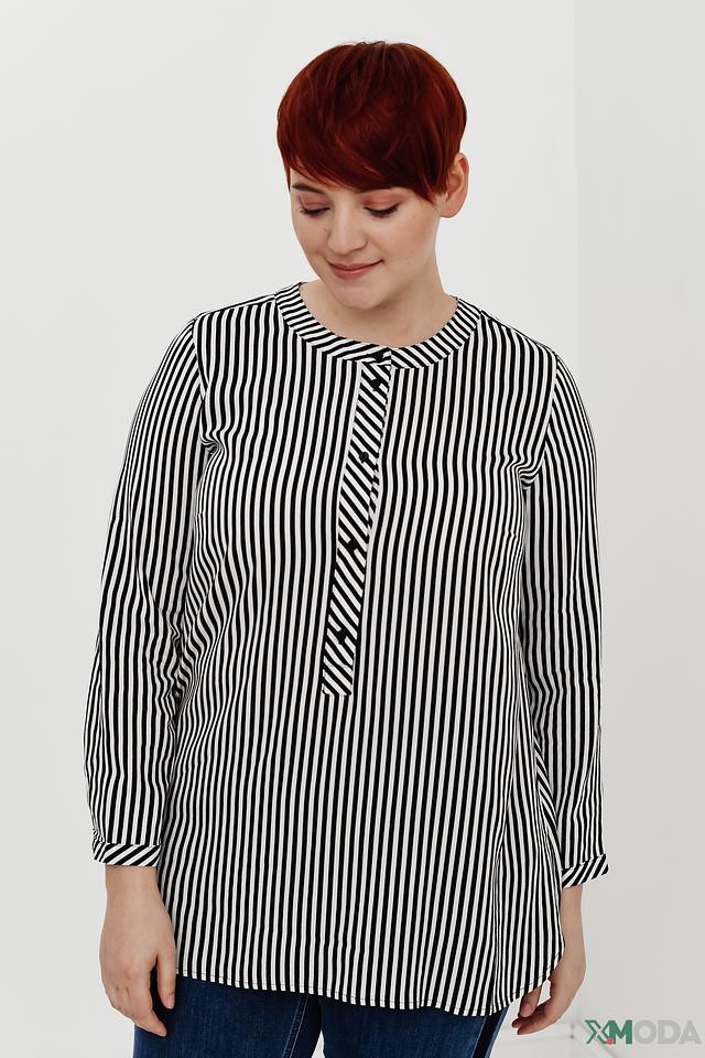 Блуза имеет классический крой с рукавами три четверти и круглым вырезом горловины. Особенностью модели является вертикальная полоска чёрного и белого цвета, которая визуально вытягивает силуэт.