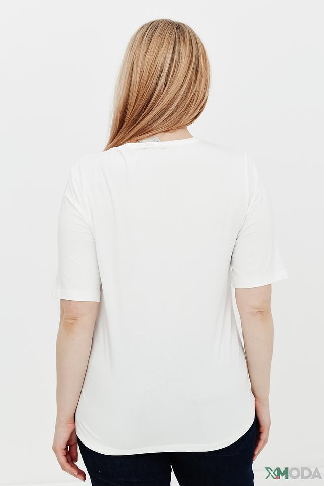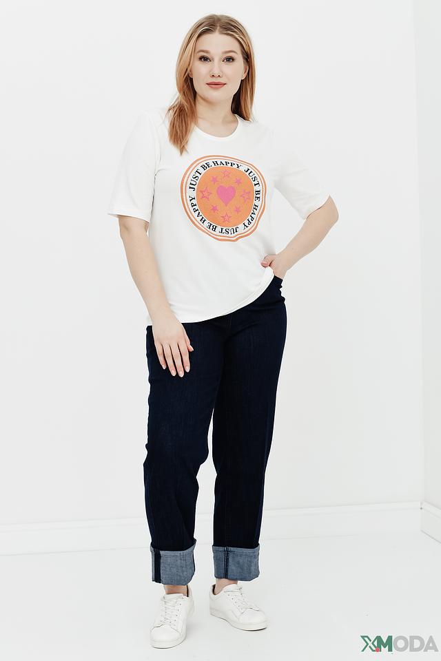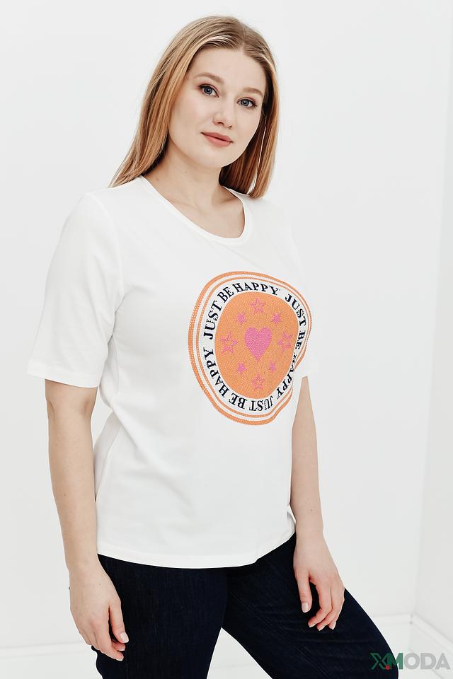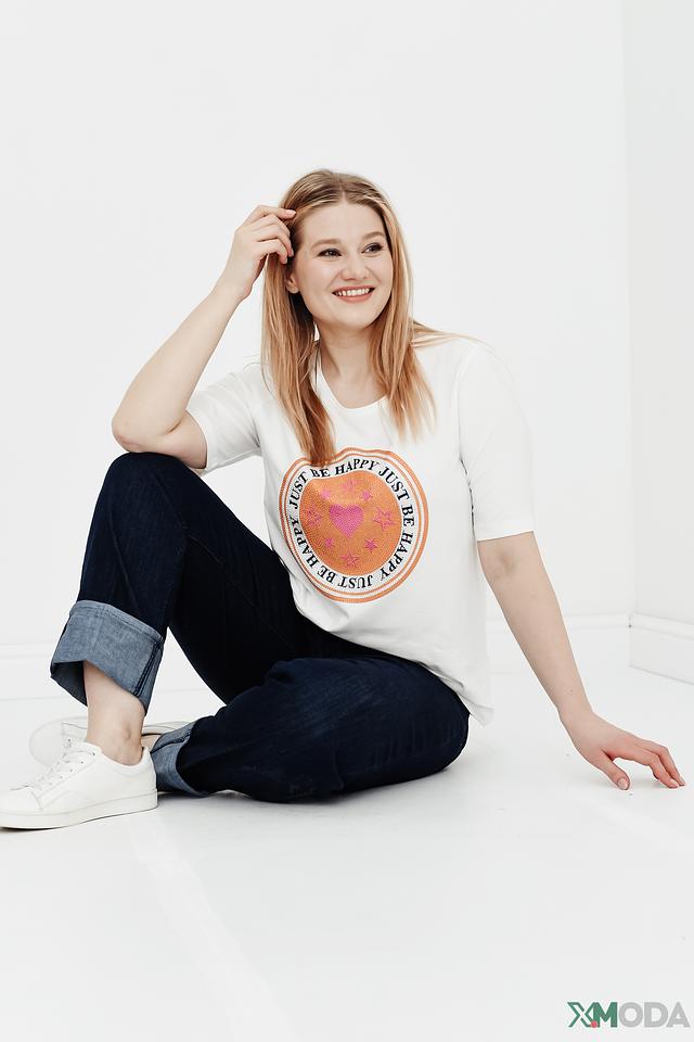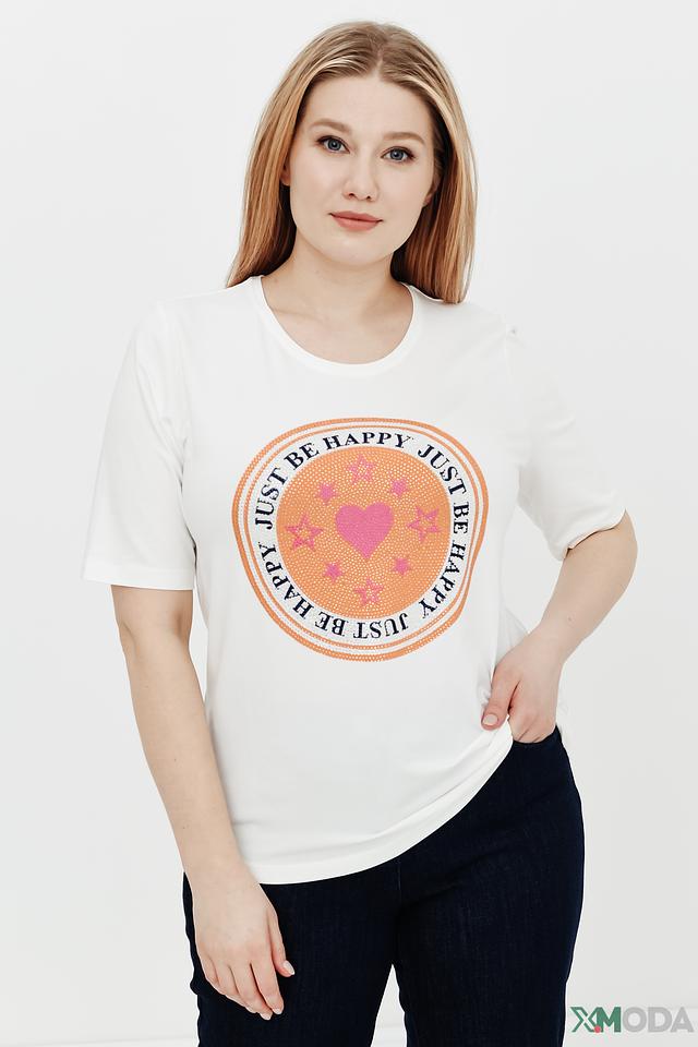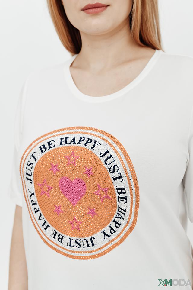 Женская футболка Via Appia белого цвета с ярким круглым принтом "Just Be Happy". Модель выполнена из мягкого и приятного к телу сочетания хлопка, модала и эластана, обеспечивающего комфорт при носке. Состав: хлопок 47%, модал 47%, эластан 6%