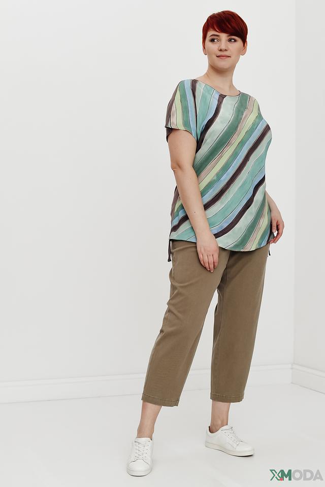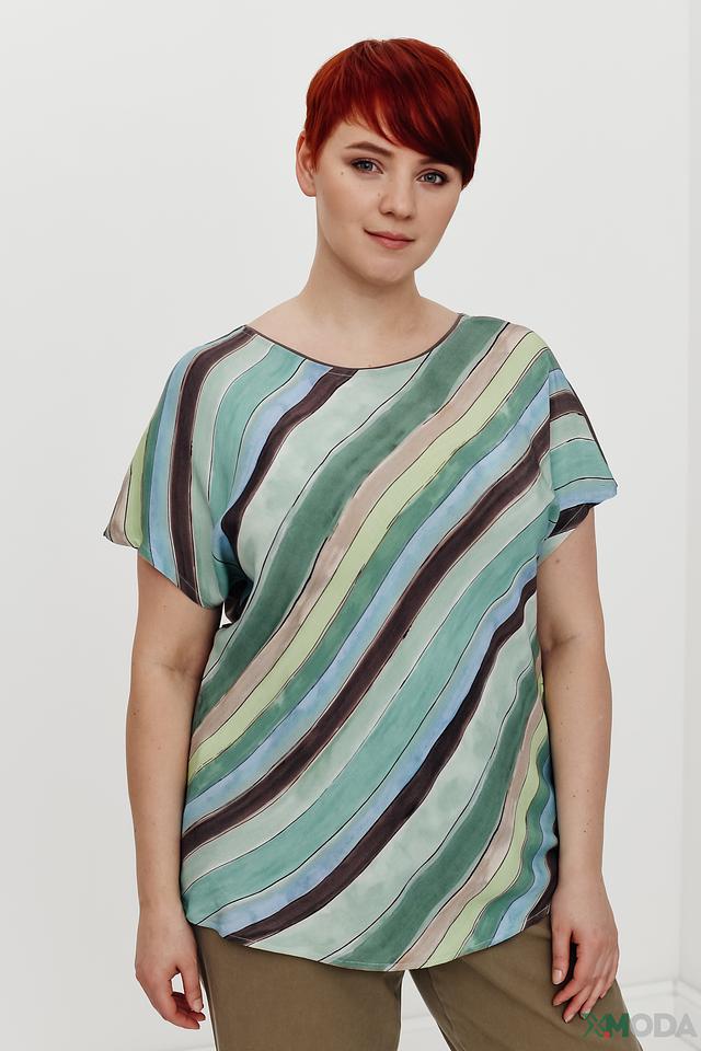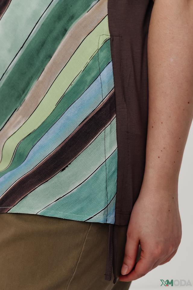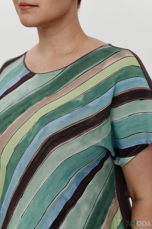 Дизайн блузы представлен в виде яркой полосатой расцветки, сочетающей в себе оттенки зелёного, голубого и коричневого. Свободный крой и короткие рукава делают эту модель идеальной для тёплой погоды. Округлый вырез горловины добавляет блузе женственности и элегантности.