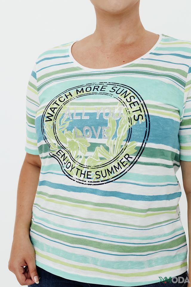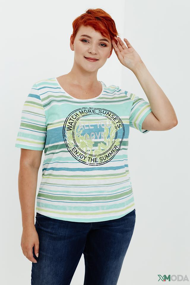 Женская футболка Via Appia в полоску, светло-зелёного оттенка, украшена круглым принтом с летней тематикой. Изготовлена из 100% хлопка, обеспечивающего комфорт и воздухопроницаемость. Состав: хлопок 100%