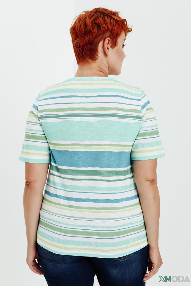 Эта стильная футболка от Via Appia станет отличным дополнением к вашему летнему гардеробу. Футболка выполнена в светло-зелёной цветовой гамме с яркими полосами, что придает ей свежий и динамичный вид.