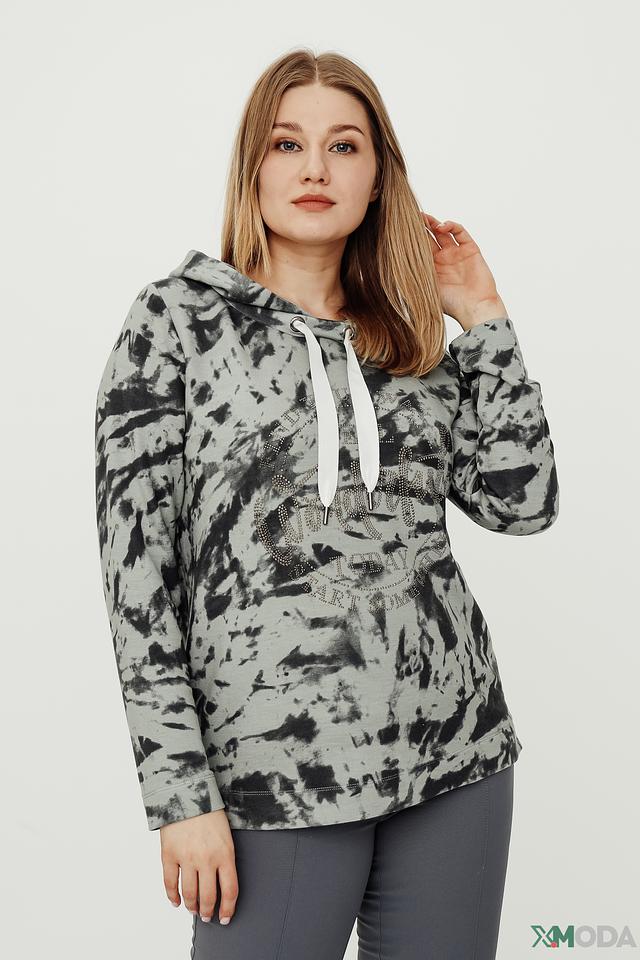 Пуловер имеет свободный крой, капюшон и длинные рукава. Его украшает эффектный принт в виде размытых пятен серого и черного цветов, создающий современный и динамичный образ.