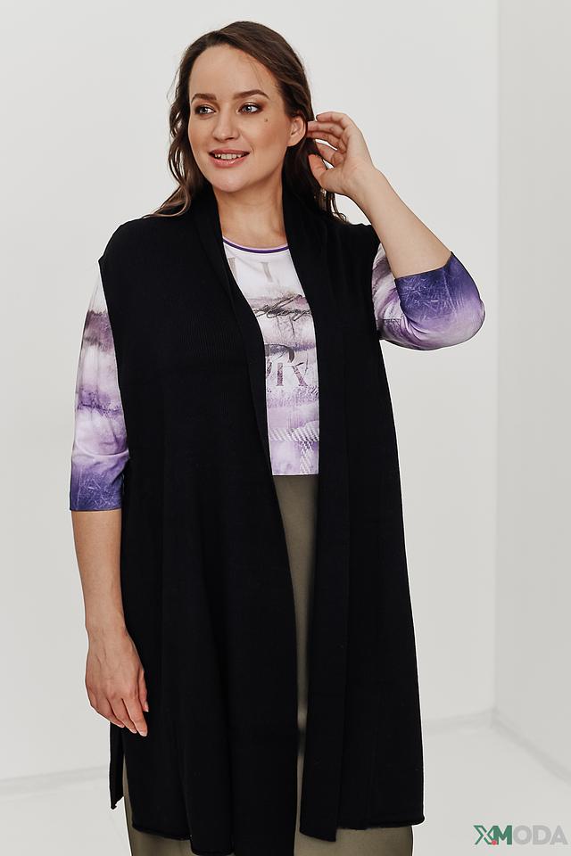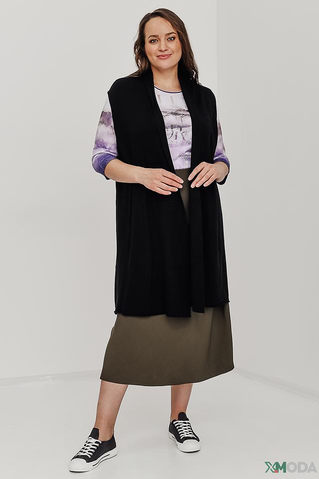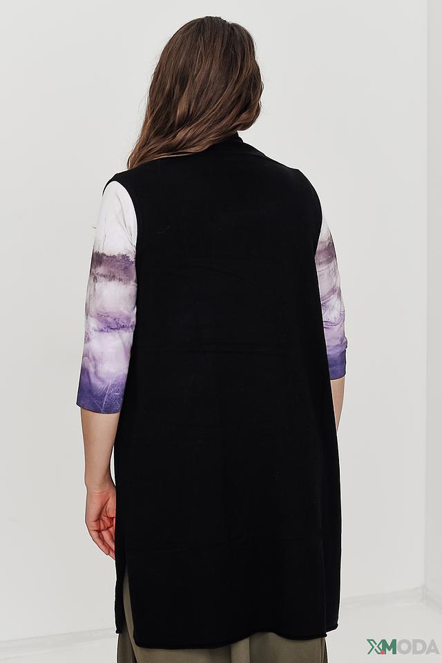 Жилет имеет удлиненный силуэт и свободный крой, что позволяет создавать различные образы – от повседневных до более элегантных. Отсутствие застежек делает его легким и удобным в использовании.