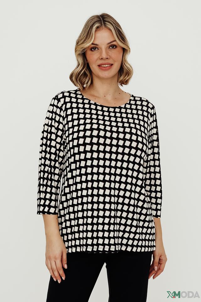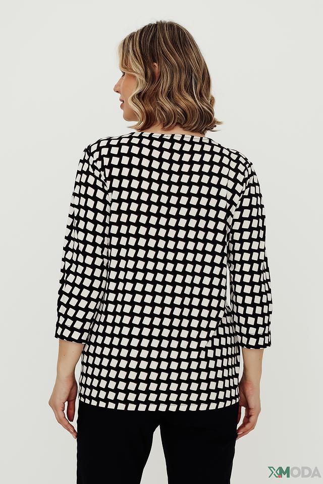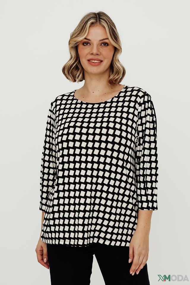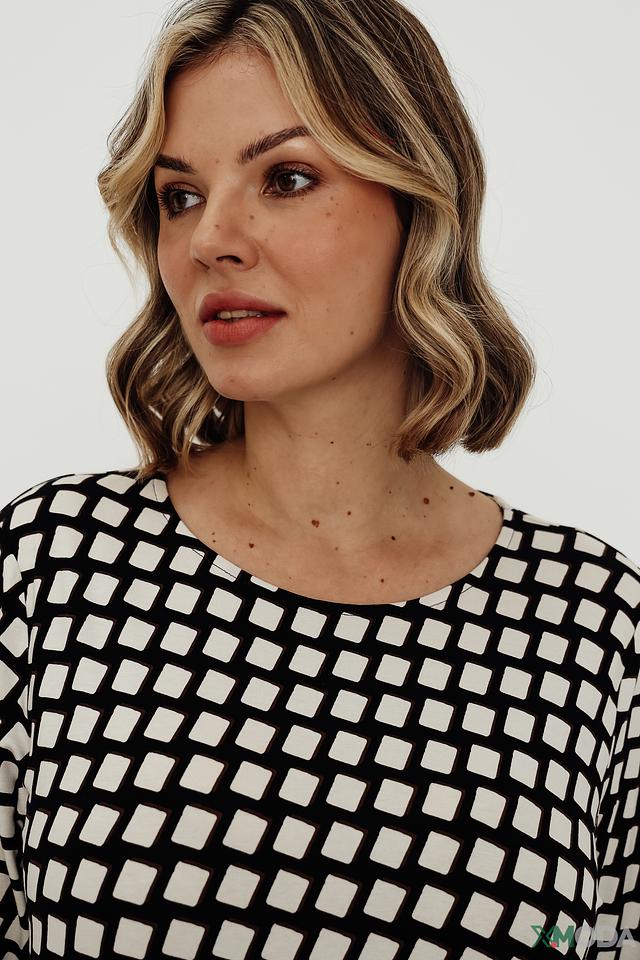 Основной цвет футболки – чёрный, украшен контрастным белым геометрическим принтом в виде ромбов. Благодаря сочетанию вискозы и эластана, футболка приятна к телу, хорошо драпируется и не сковывает движений.