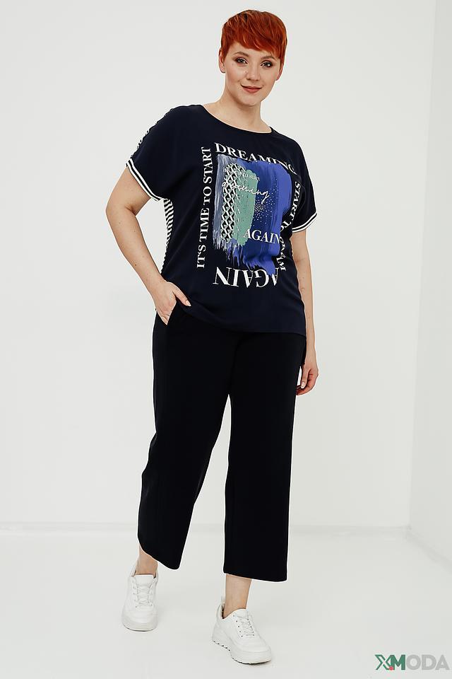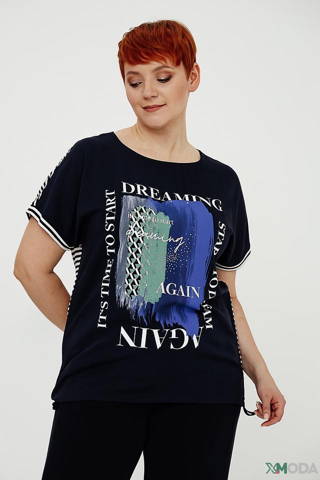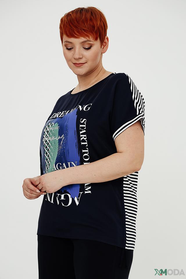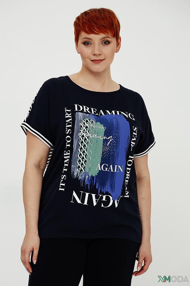 Женская футболка Via Appia черного цвета с ярким графическим принтом. Модель из 100% вискозы отличается свободным кроем и короткими рукавами с белой полоской. Состав: вискоза 100%