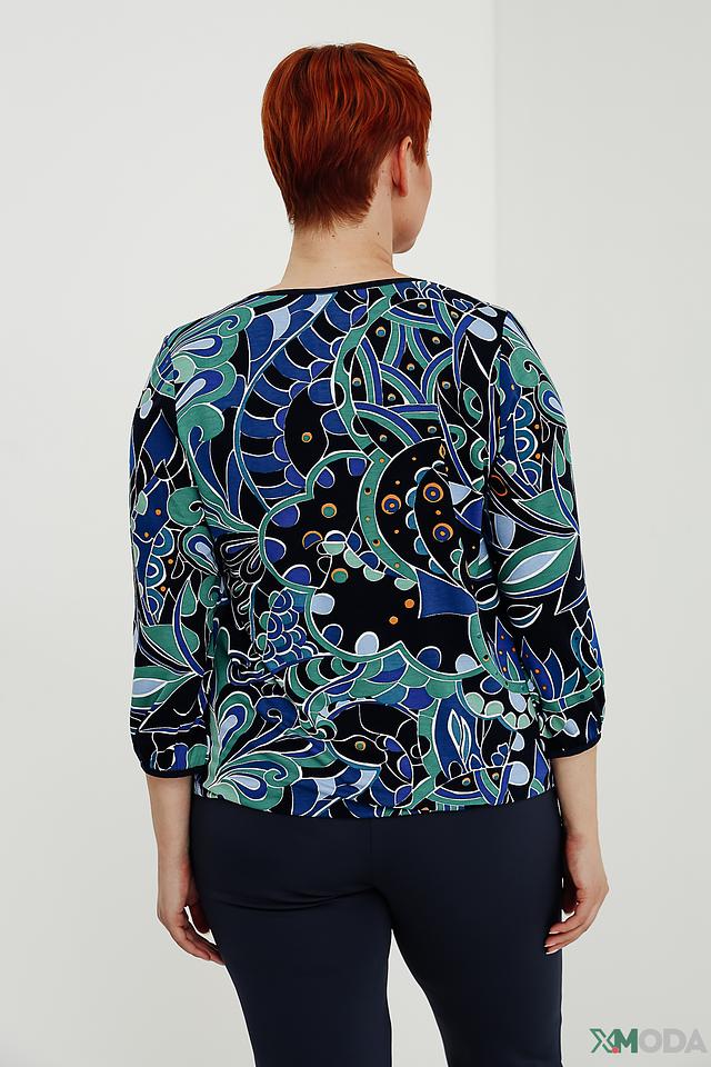 Основной цвет блузы – чёрный, а яркий принт с изображением цветов и листьев в оттенках синего и зелёного делает её особенно привлекательной. Блуза имеет округлый вырез горловины и рукава длиной три четверти, что делает её универсальной для разных случаев.