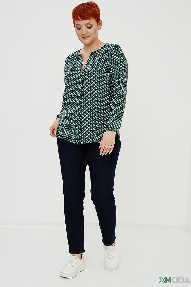 Блуза имеет яркий геометрический принт в сочетании зеленых и белых оттенков. V-образный вырез горловины и длинные рукава придают ей женственность и изящество. Свободный крой не сковывает движений и позволяет создать расслабленный силуэт.