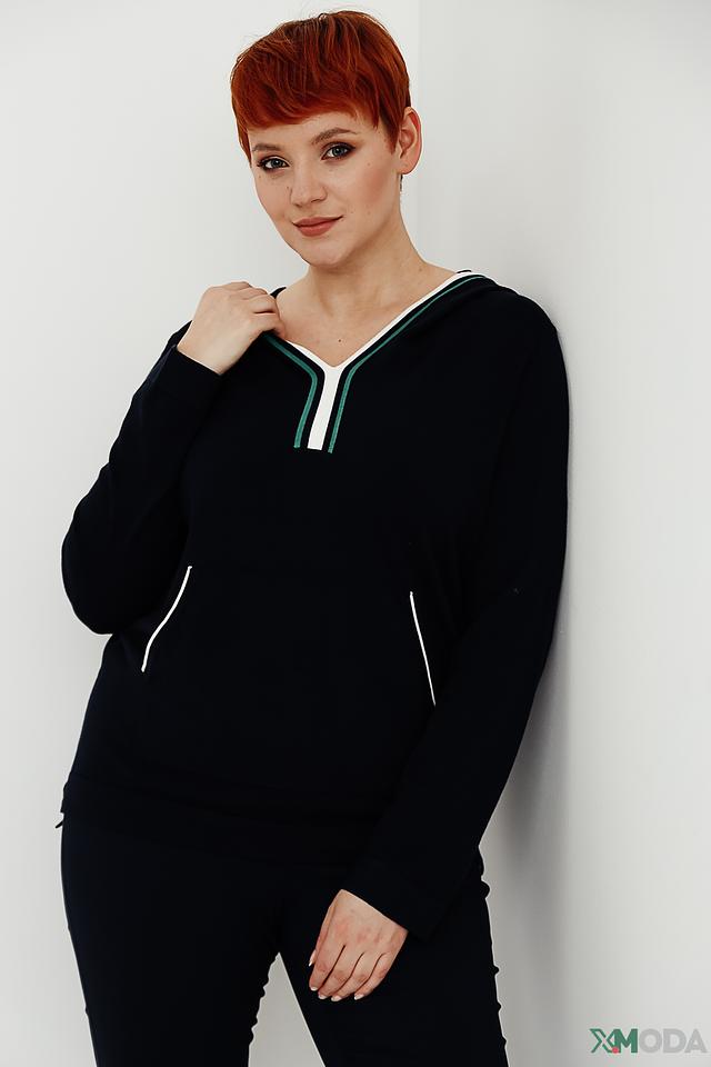 Модель имеет удобный капюшон и оформлена контрастной белой и зелёной отделкой по горловине и на карманах, что придает ей особый шарм. Пуловер имеет длинные рукава и свободный крой, обеспечивающий свободу движений.