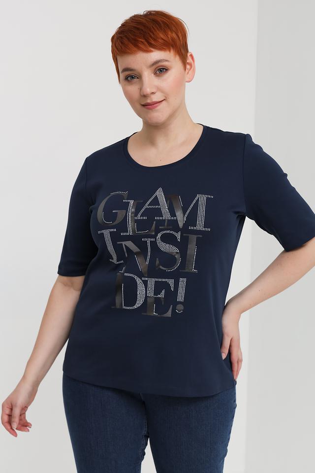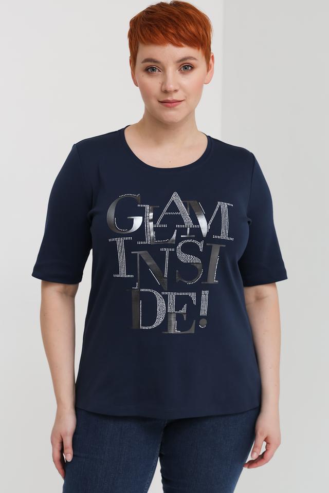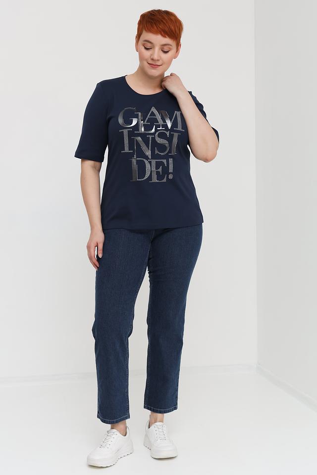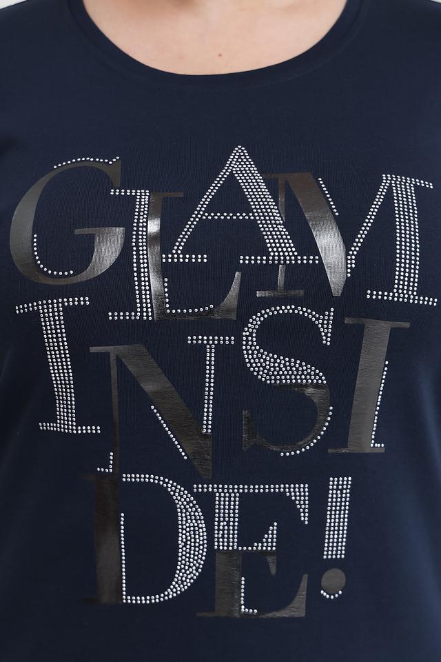 Основной цвет футболки – насыщенный тёмно-синий, который хорошо сочетается с различными элементами гардероба. Главная особенность модели – яркий и привлекательный принт "GLAM INSIDE!", выполненный в серебристых тонах с добавлением страз, что придает ей особый шарм.