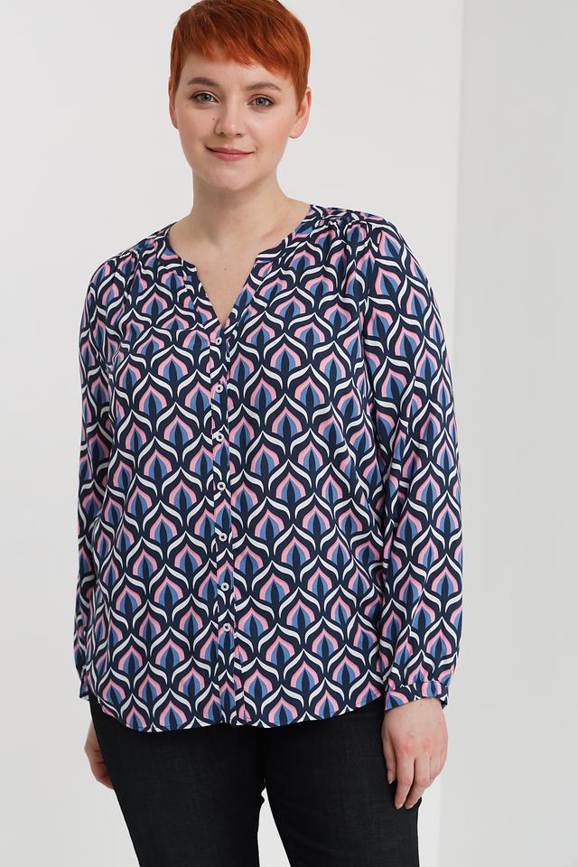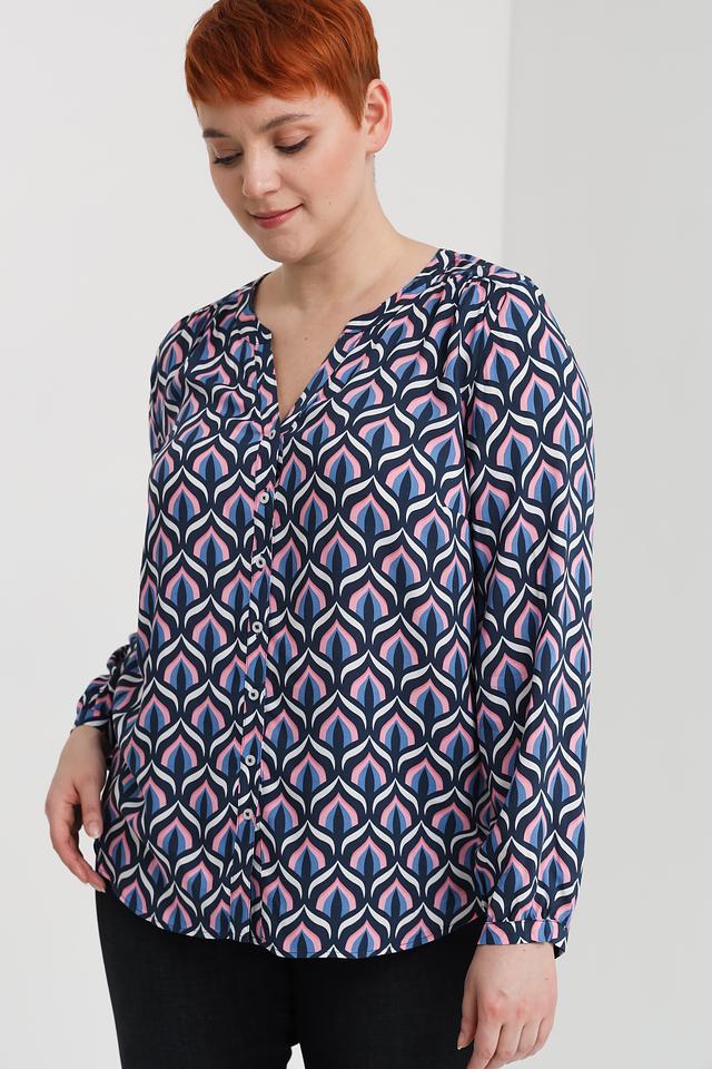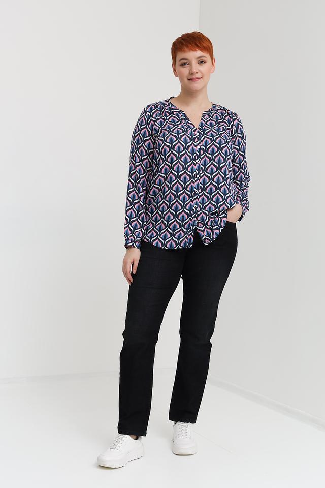 Особенностью данной блузы является яркий и необычный геометрический принт, выполненный в сочетании синего, розового и белого цветов. Этот принт делает блузу уникальной и привлекательной. Блуза идеально подойдет для повседневной носки, а также для особых случаев.