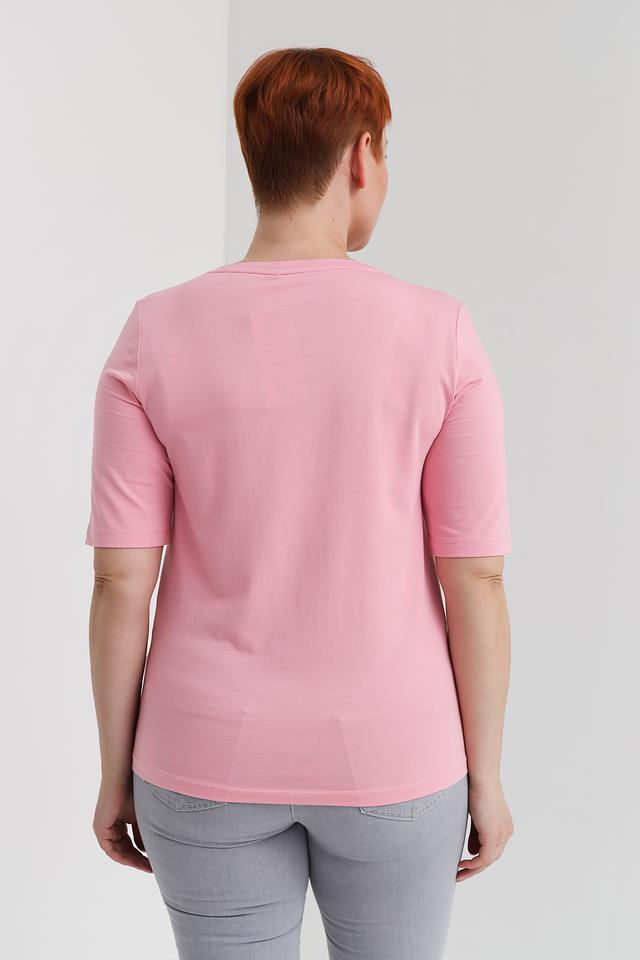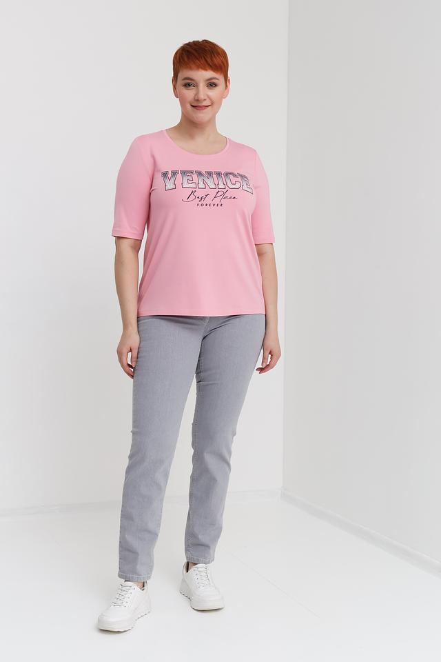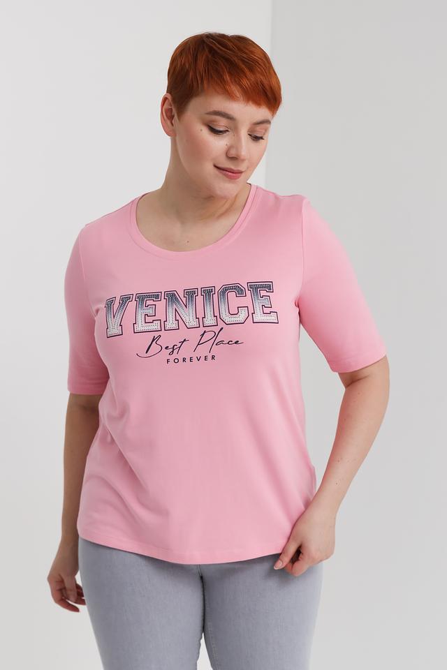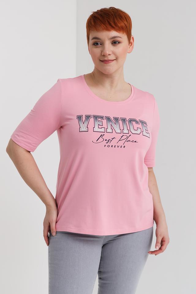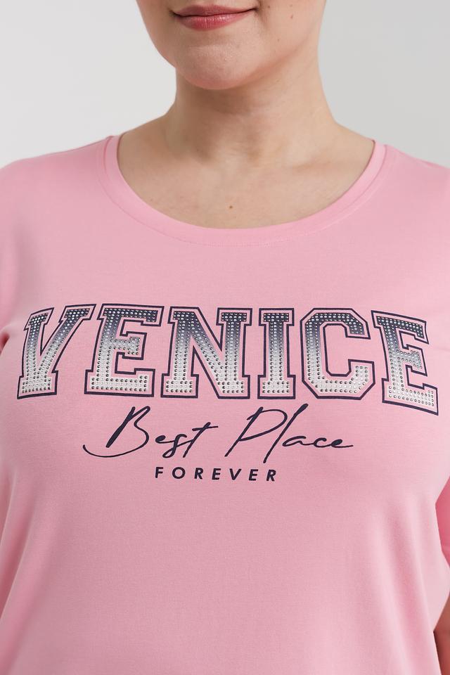 Розовая футболка Via Appia DUE с ярким принтом "Venice". Модель выполнена из мягкого хлопка с добавлением модала и эластана, обеспечивающих комфорт и хорошую посадку по фигуре. Состав: хлопок 47%, модал 47%, эластан 6%