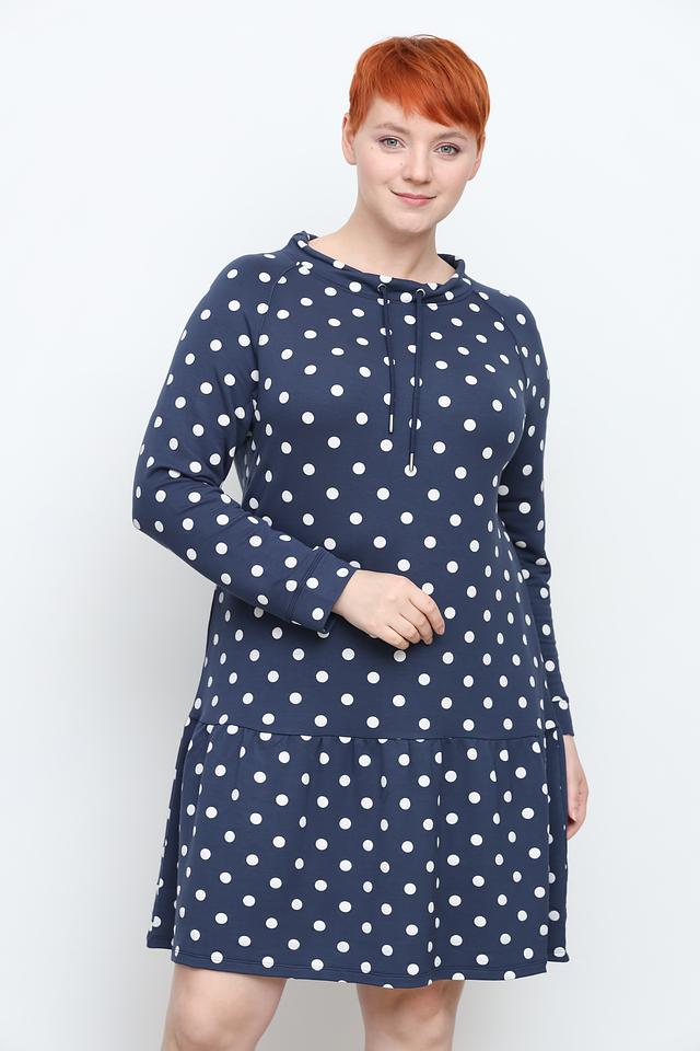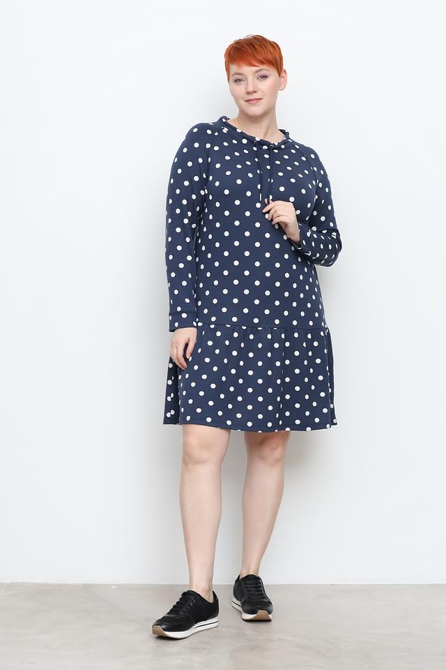 Платье Via Appia синего цвета с белым горошком – стильное и комфортное решение для повседневного образа. Модель с длинными рукавами и округлым вырезом горловины, дополненным завязками, и присборенной юбкой. Состав: вискоза 59%, полиэстер 36%, эластан 5%