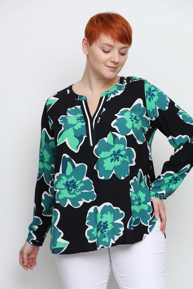 Основной цвет блузы – чёрный, который служит прекрасным фоном для крупного цветочного принта в оттенках зелёного. V-образный вырез горловины дополнен белой окантовкой, что добавляет контрастности и свежести.