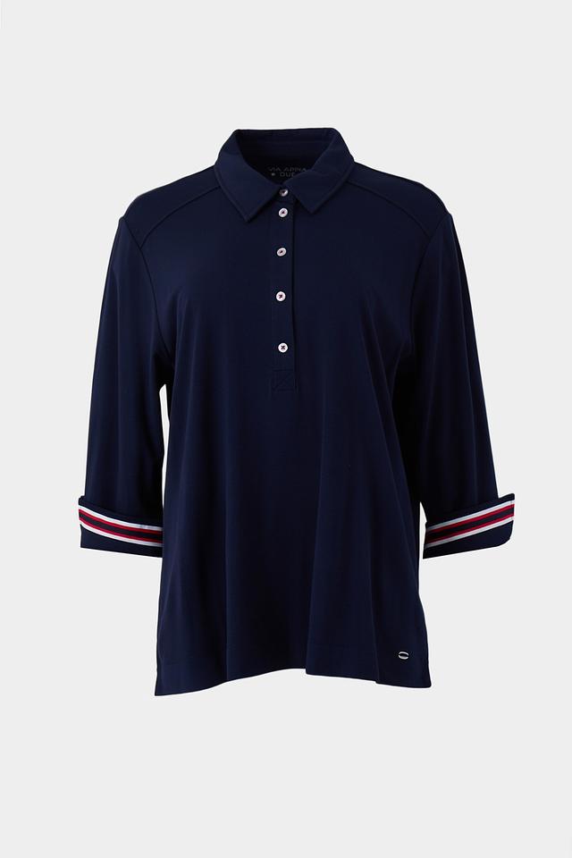 Темно-синяя блуза от Via Appia – это стильная модель поло-рубашка с короткими рукавами и декоративной полосой на манжетах. Изготовлена из мягкой вискозы с добавлением полиамида и эластана для комфорта и удобства. Состав: вискоза 80%, полиамид 16%, эластан 4%