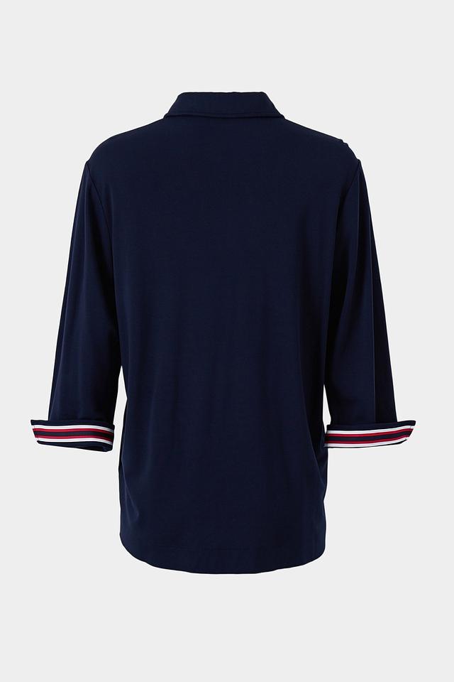 Рукава блузы 3/4, с манжетами, украшенными декоративной полосой в красно-белую полоску. По низу блузы также присутствует небольшая декоративная полоса. Свободный крой обеспечивает комфорт при носке.