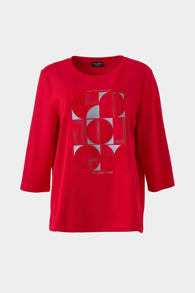 Женский пуловер Via Appia насыщенного красного цвета с оригинальным графическим принтом. Модель имеет удобный свободный крой и рукава 3/4, идеально подходит для создания комфортных и стильных образов. Состав: полиэстер 45%, вискоза 43%, эластан 12%