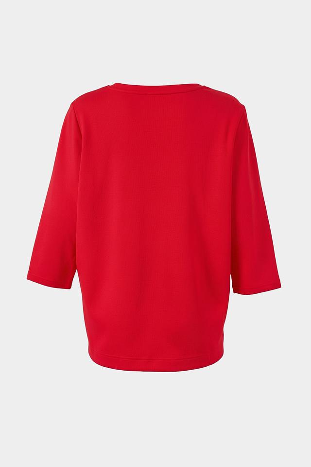 Яркий красный цвет пуловера привлекает внимание и добавляет образу энергии. Передняя часть украшена стильным графическим принтом, который делает модель более интересной и запоминающейся. Свободный крой не сковывает движений, а рукава 3/4 делают пуловер универсальным для любого времени года.