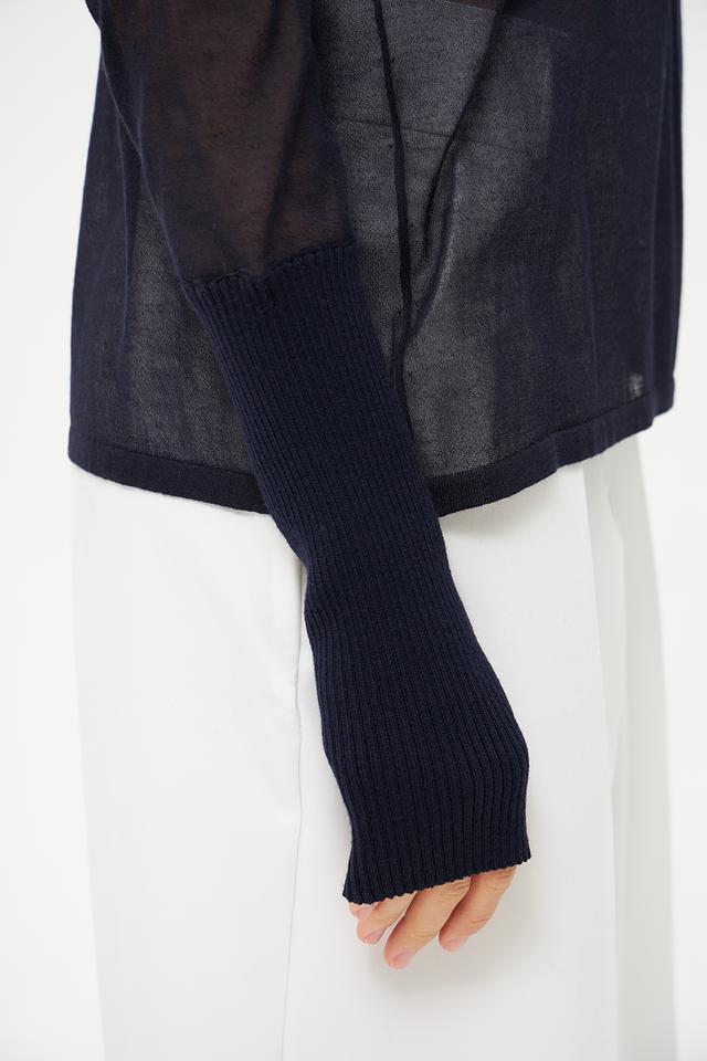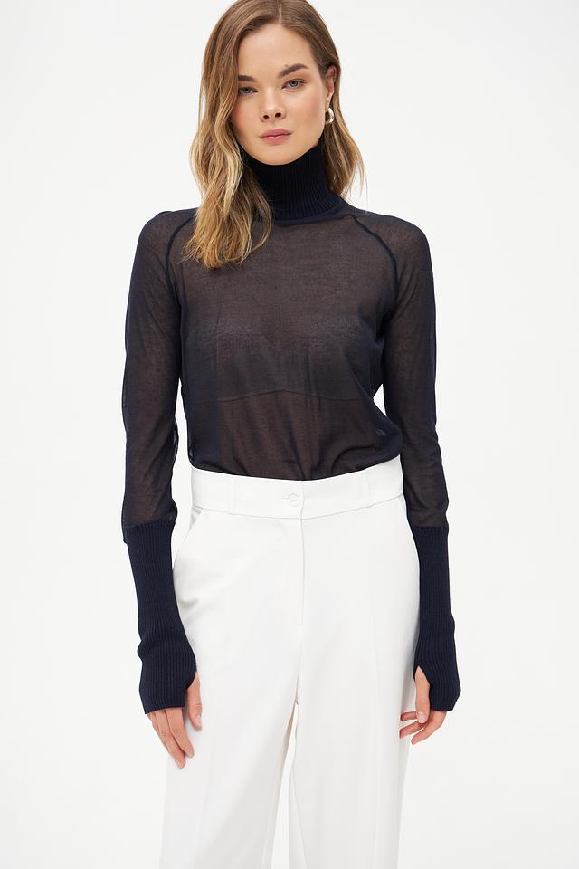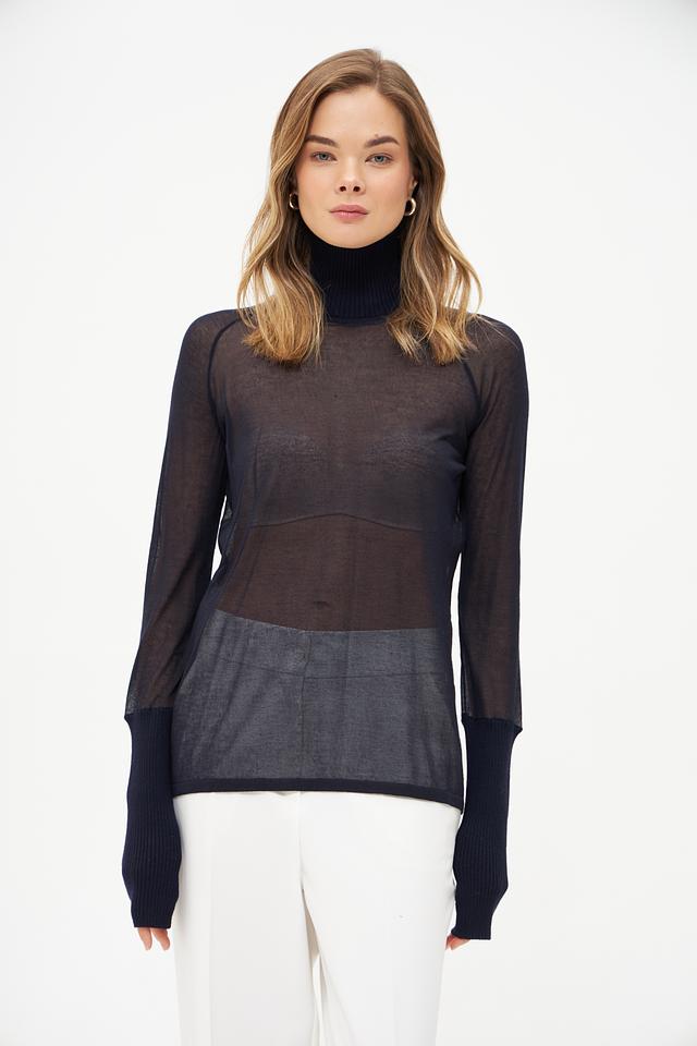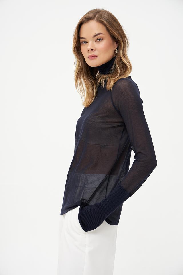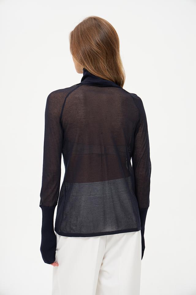 Водолазка Annette Gortz темно-синего цвета с полупрозрачным корпусом и трикотажными рукавами. Изготовлена из мягкого микромодала с добавлением нейлона и шерсти мериноса. Состав: микромодал 50%, нейлон 35%, шерсть мерино 15%